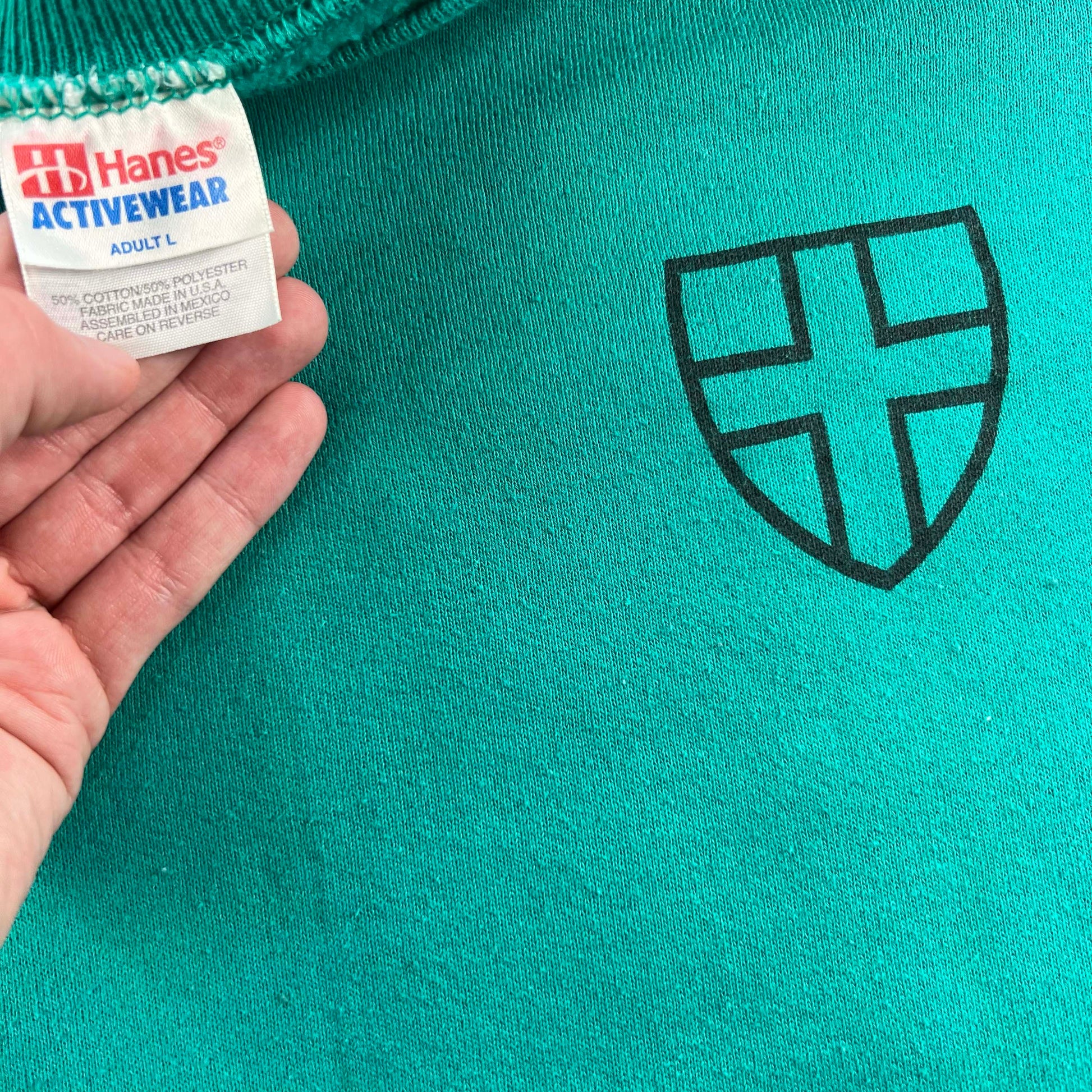 love this one from Forest Grove, Oregon!! they did Narnia as a play. tagged a L but i'd say fits a M best with the shorter sleeves! nice cross on the front and teal green color
