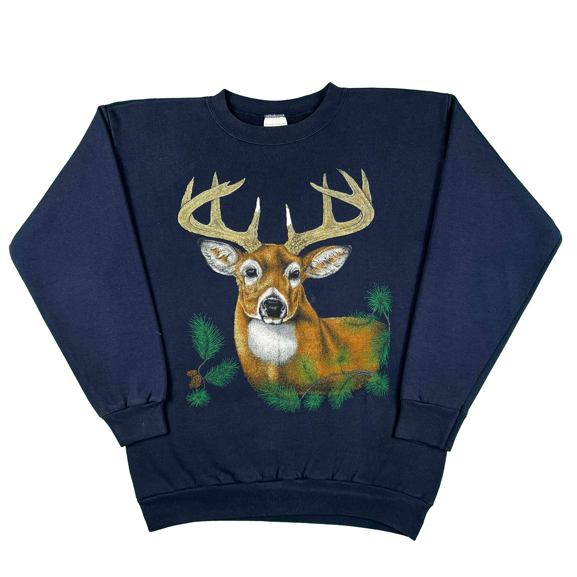 great buck graphic!!!! 8 point? faded navy blank. I really love the loud animal print vintage sweats and tees!