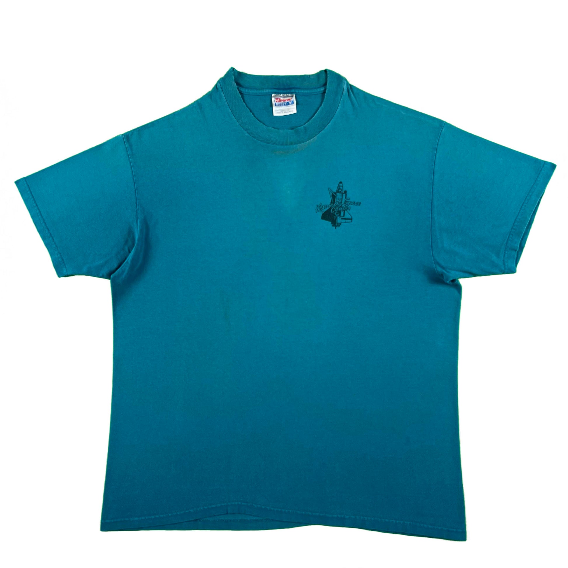cool aqua/teal green colored spaceship tee!! love the backhit and nice wear throughout, especially on the collar