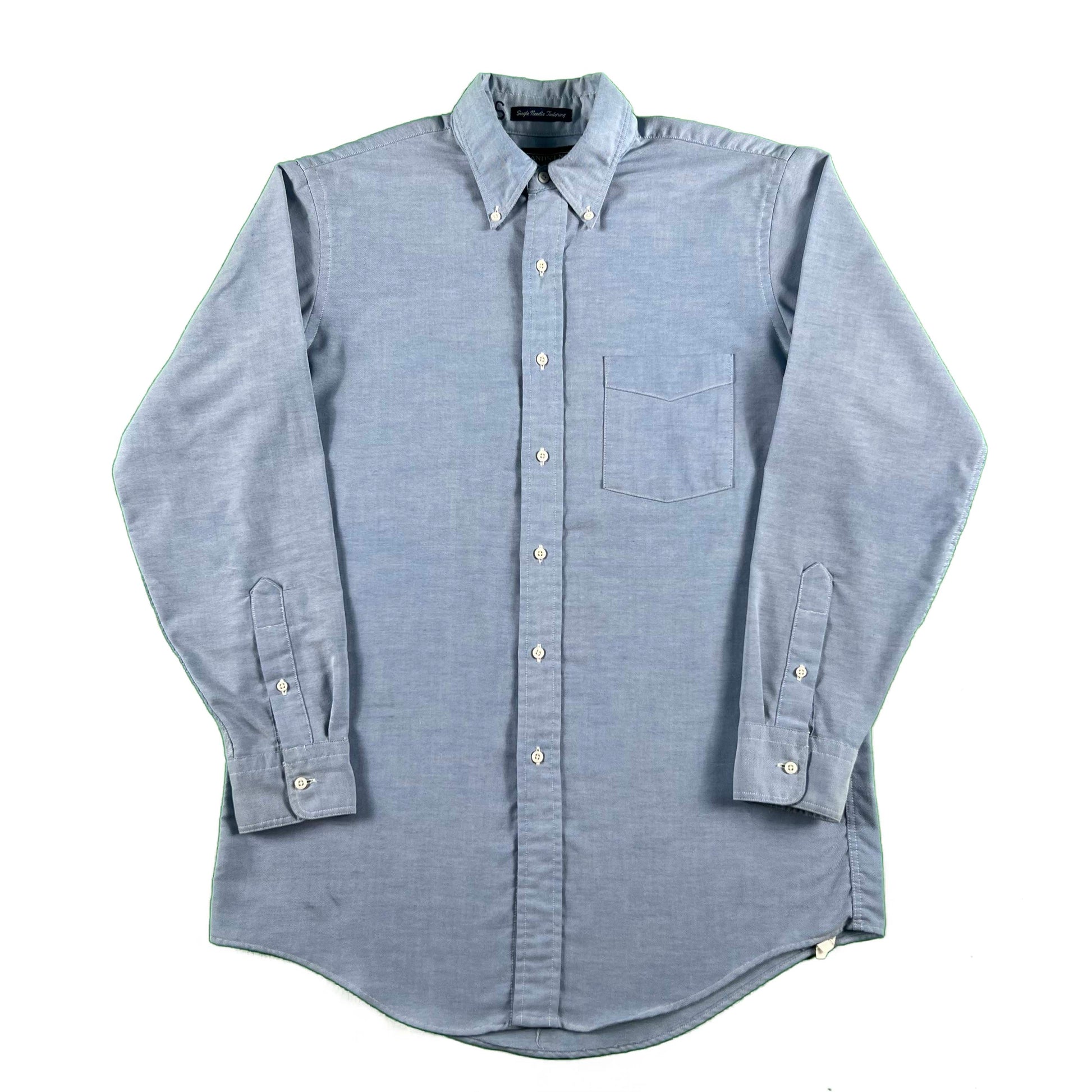 I was about to add this to the Lands' End 100% Cotton Button Ups listing but this is a poly blend! nice lighter weight and made in usa. 'Single Needle Tailoring' and a truly perfect shirt to dress up or down as the weather warms up. classic preppy blue