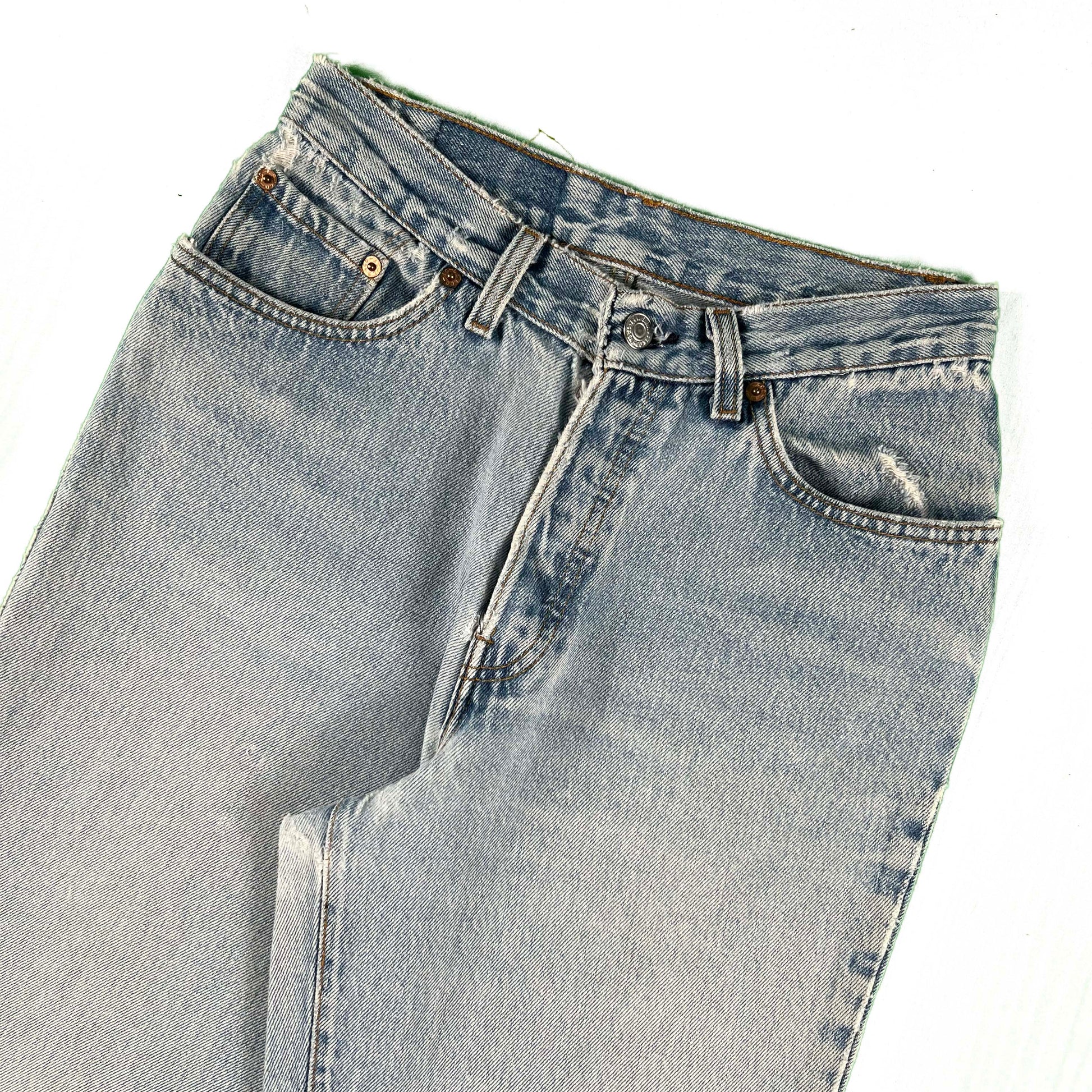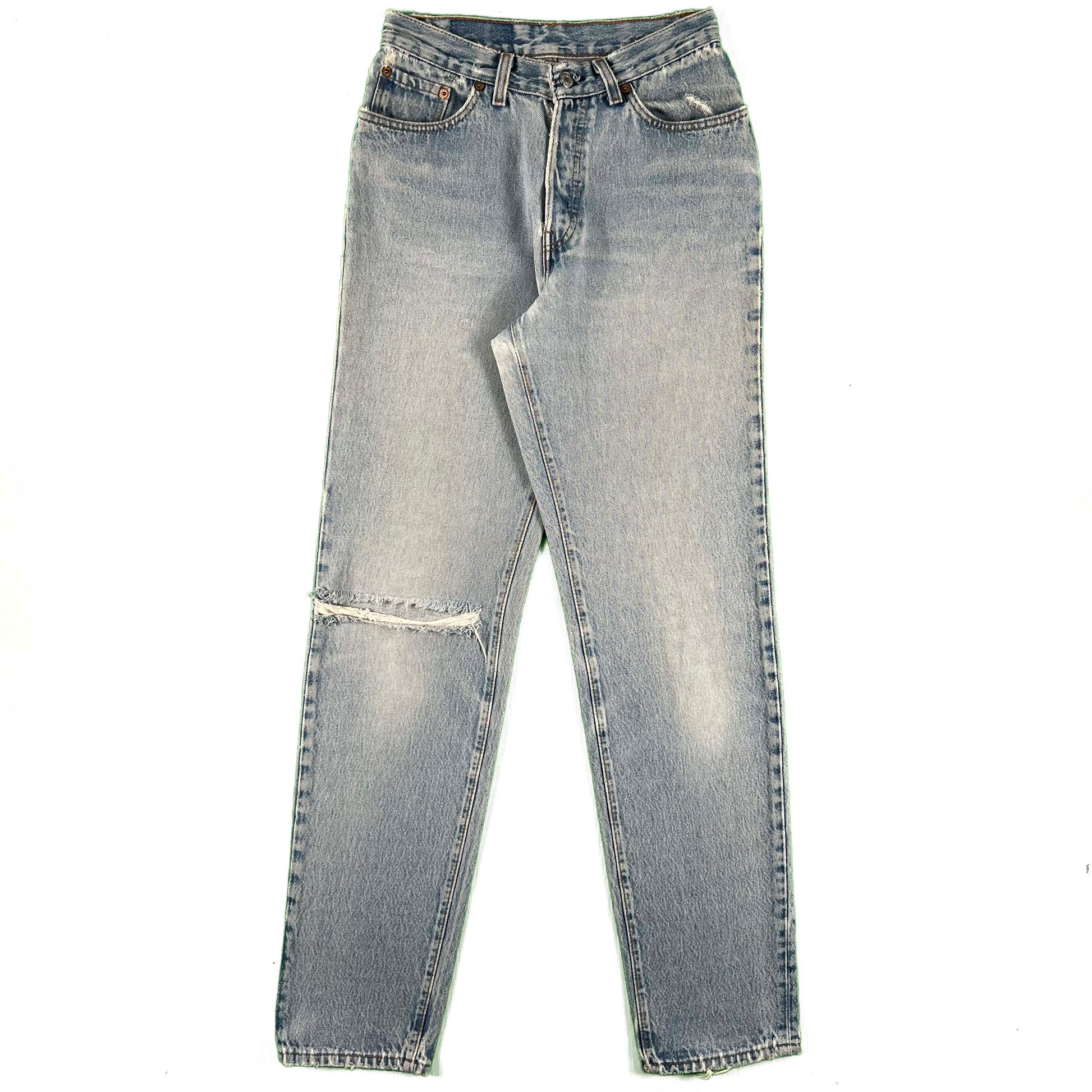 great faded light wash!!! love the lil knee rip, like a higher rise tapered 501 type of fit