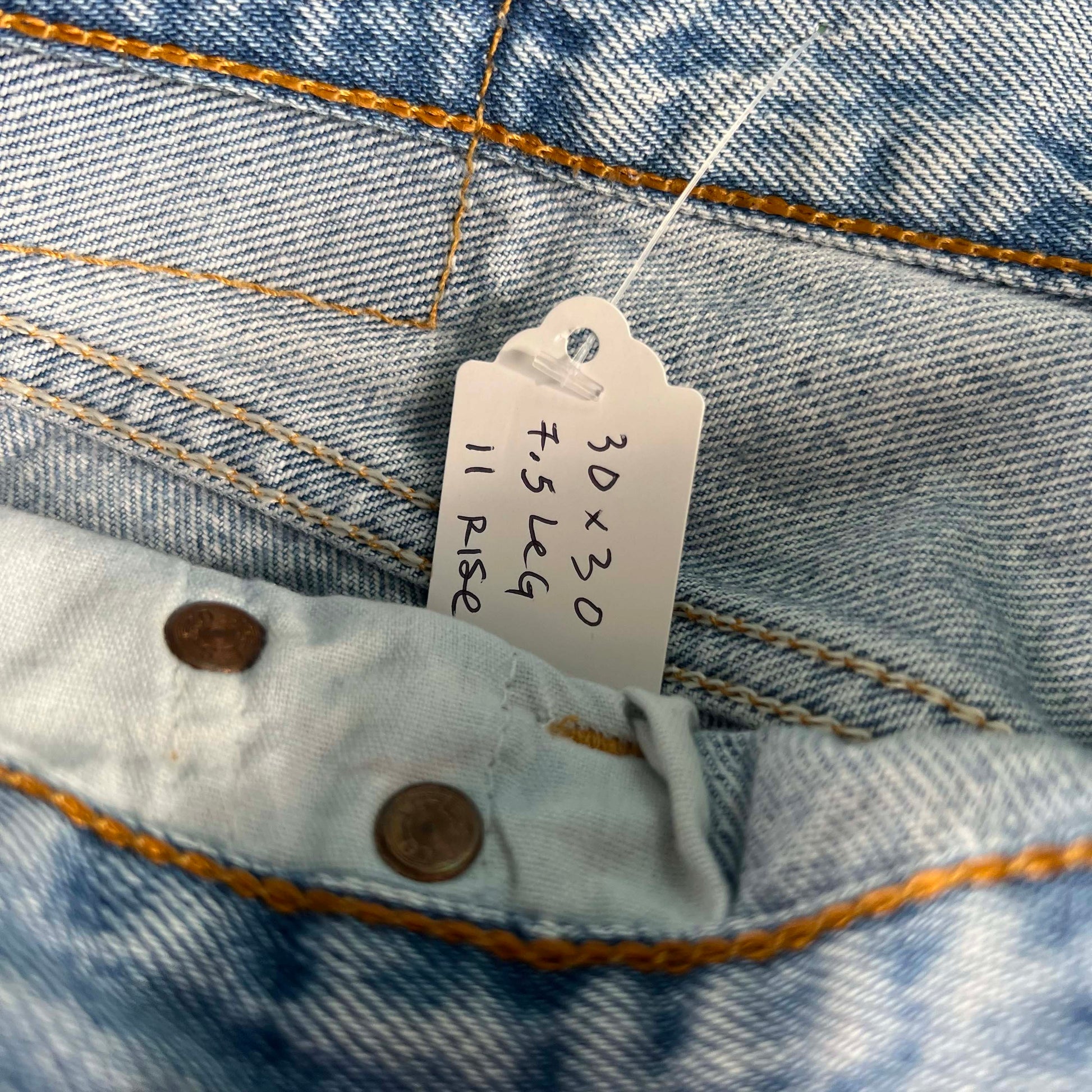 really nice light wash!! has some holes and rips if you choose to repair :)