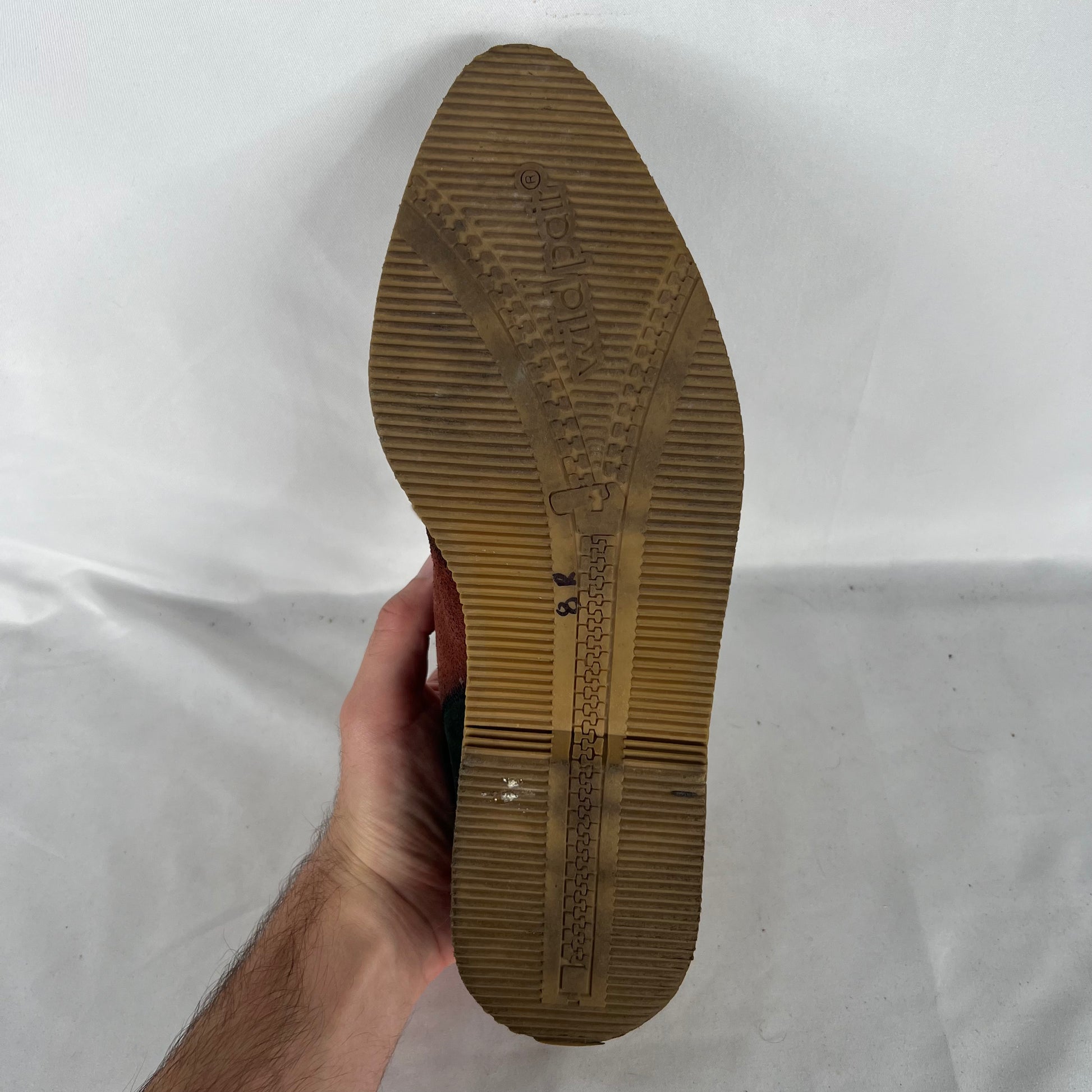 so sick!!! love the colors and patchwork pattern with suede leather, really cool soles with zipper like detailing. bit of wear/stain on part of the suede. Brand is Wild Pair which closed in 1999. Oxford style shoes with a pointier toe!!