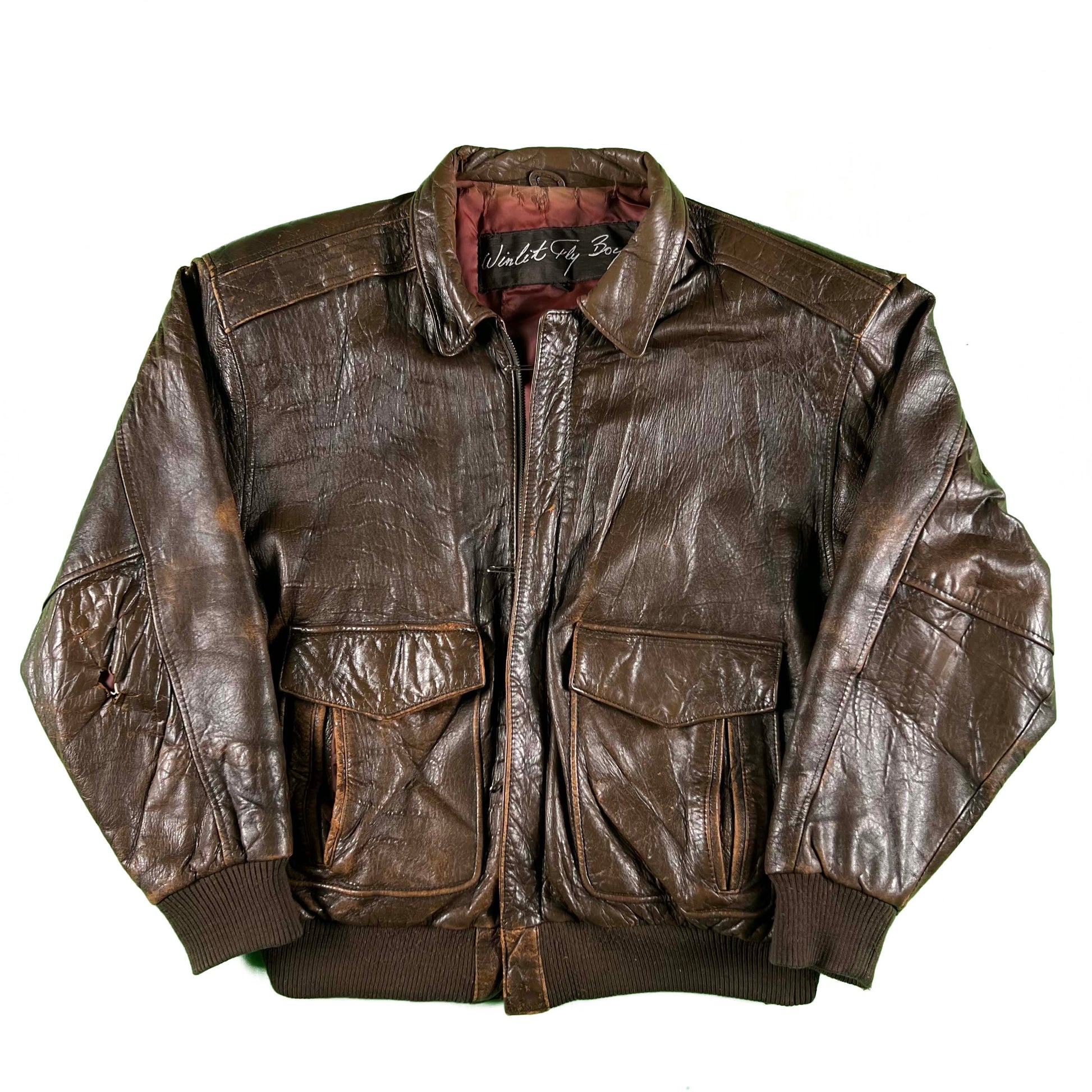 great brown leather jacket with an A2 bomber design!! still has the zipper but I can't get it to teeth to stay together!! added some safety pin closures, has some wear and rips on the jacket and lining too. Winlit Fly Boys tag!! cool snap pocket additions