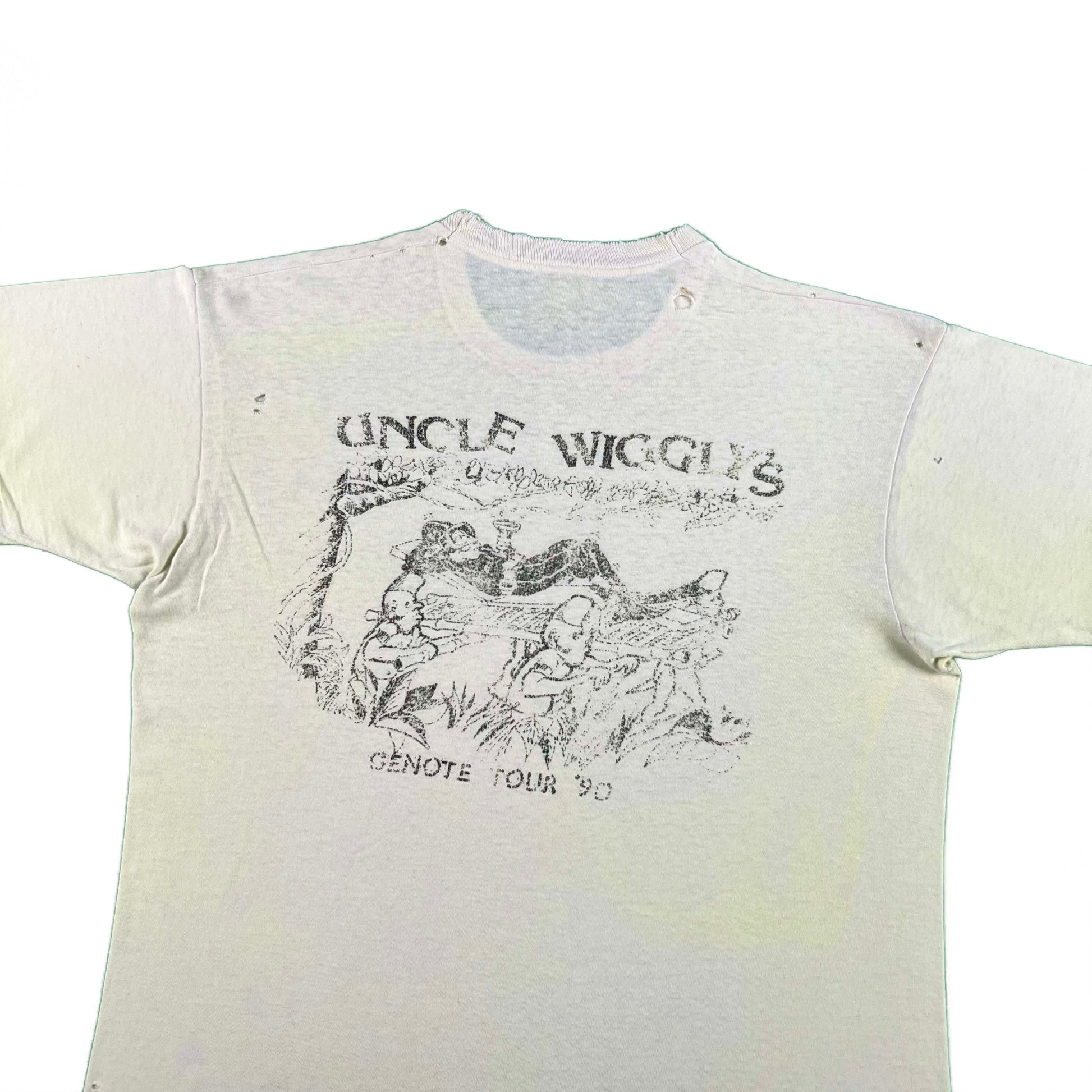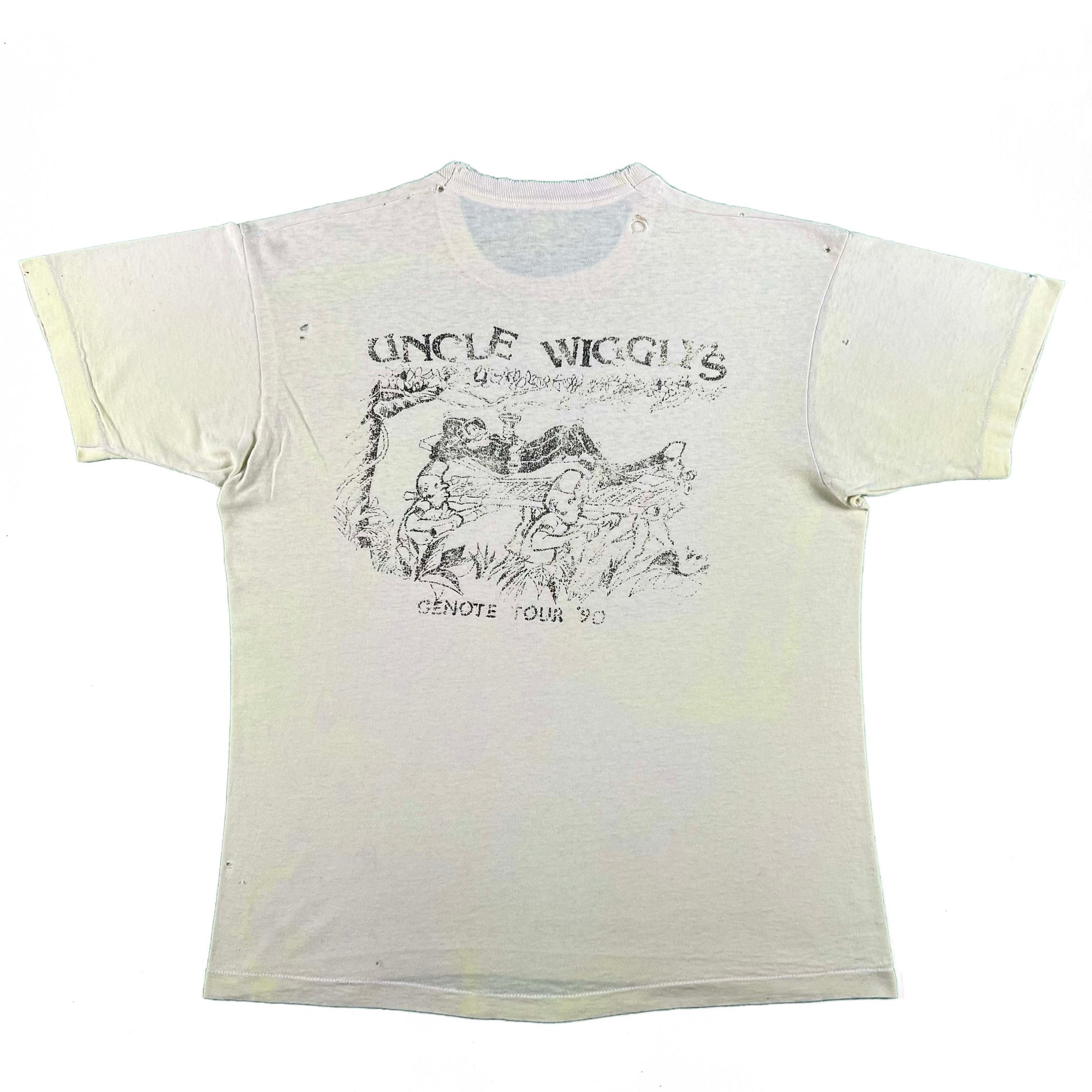 such a good key lime yellow/white color with a few bright spots!! some kind jungle survival prep camp or something!! big back hit. paint or something on the front!! Uncle Wiggly's Cenote Tour 1990