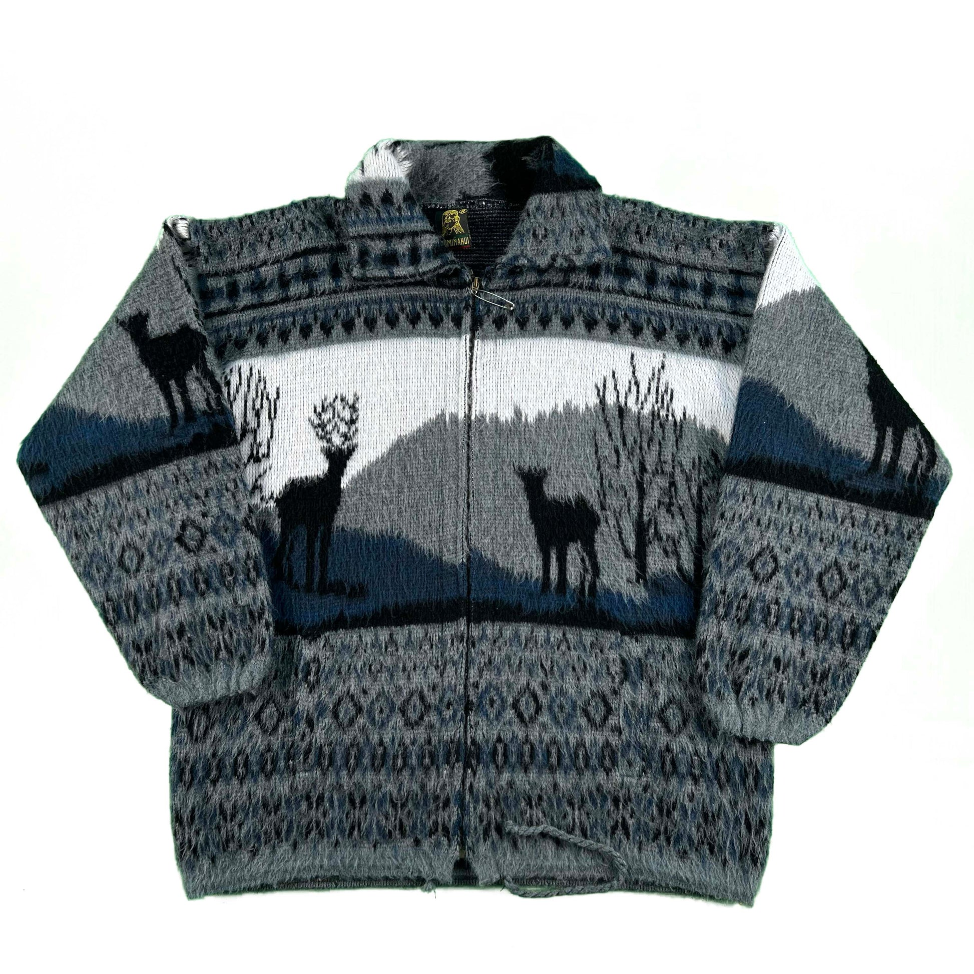 shaggy wool deer fleece jacket that was made in Ecuador!! super soft and cozy with an oversized fit. love the pockets and grey/navy/white colors. zipper pull is missing but it still works(and I added a big safety pin so it zips easier)