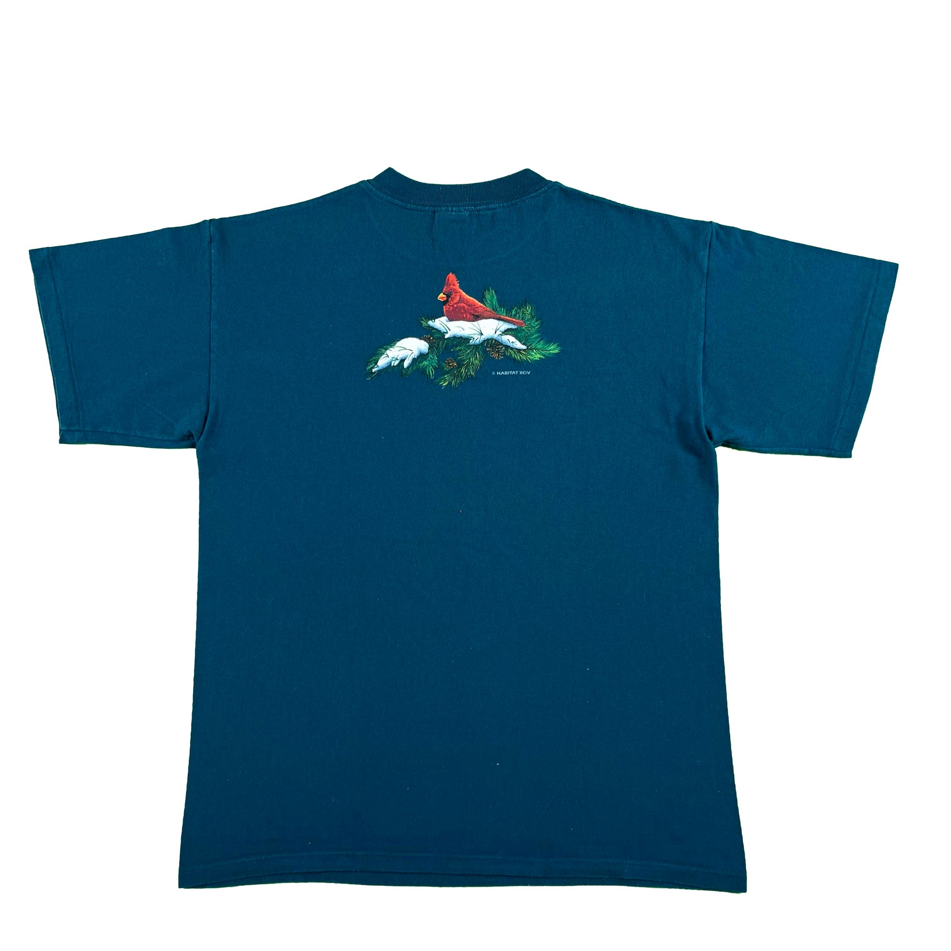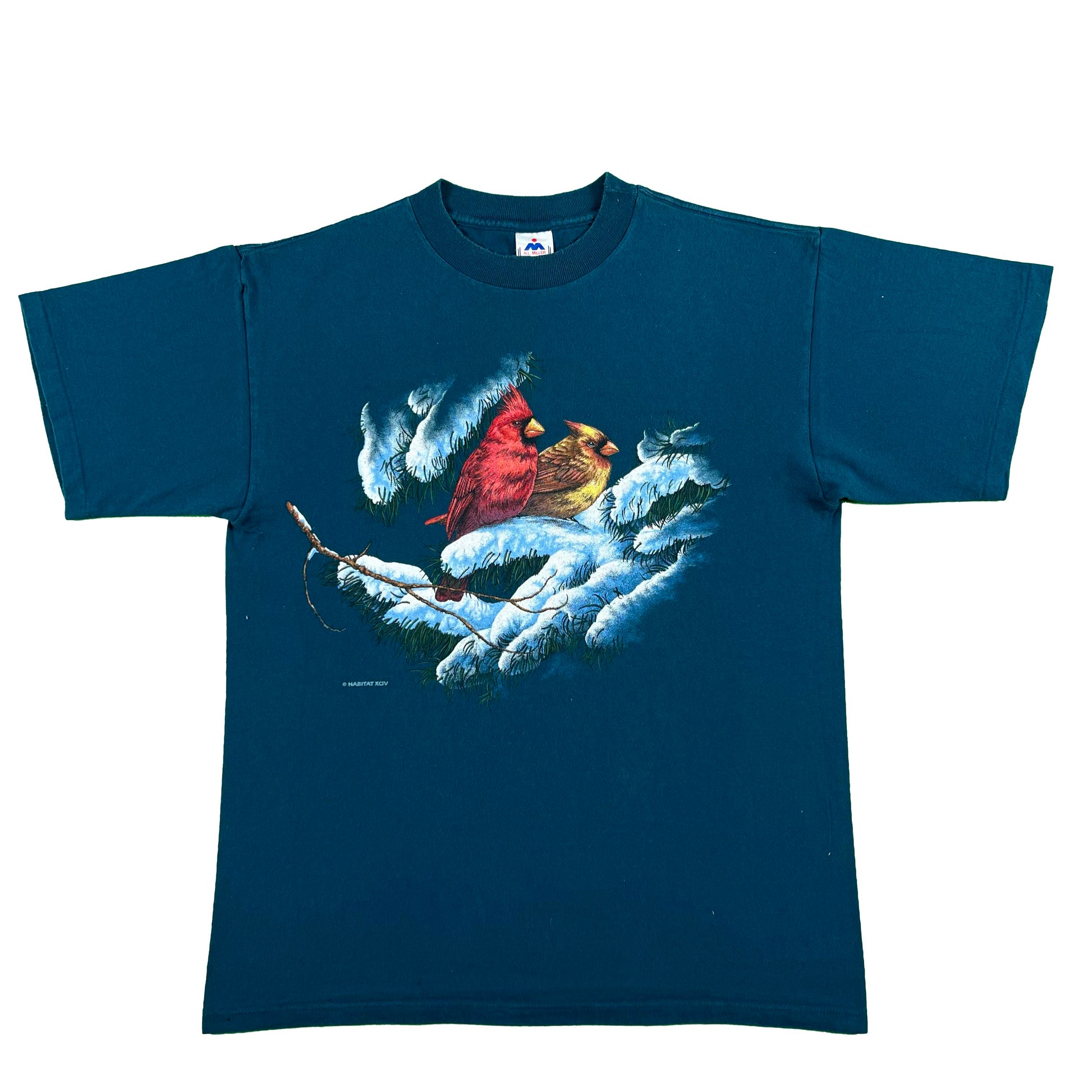 so cute and gives me cozy vibes!! a couple of birds(cardinals) sittings on some snowy branches. has a small singular one on the back too!