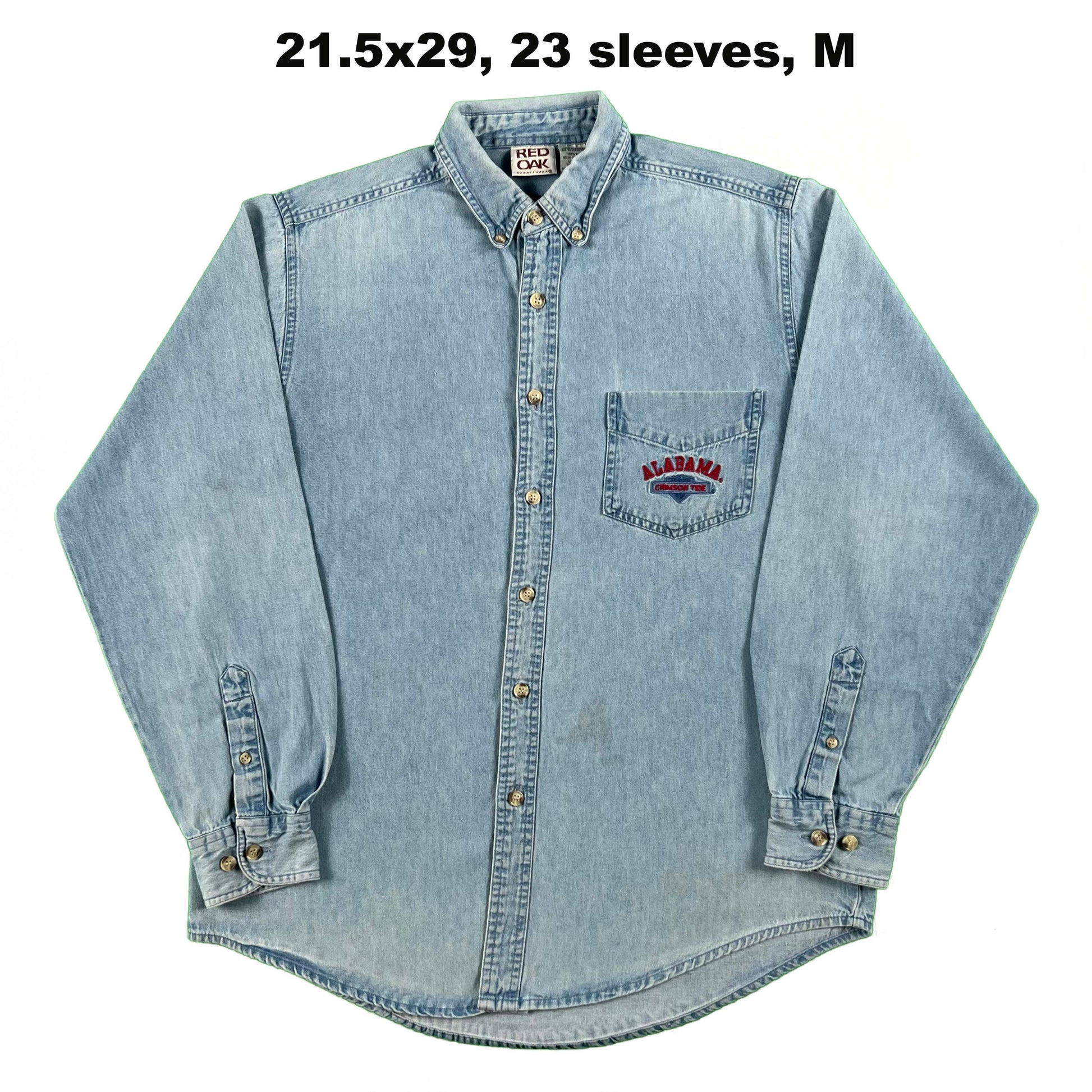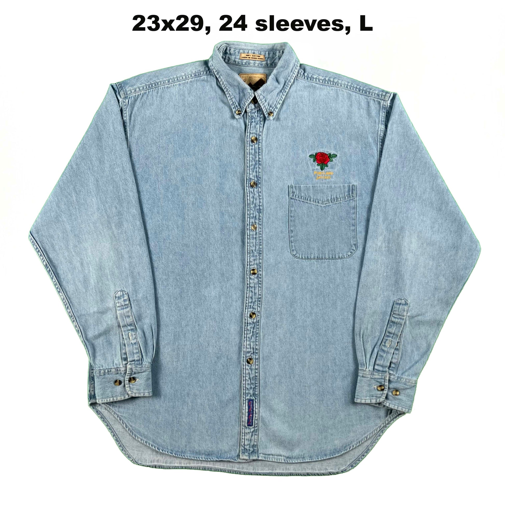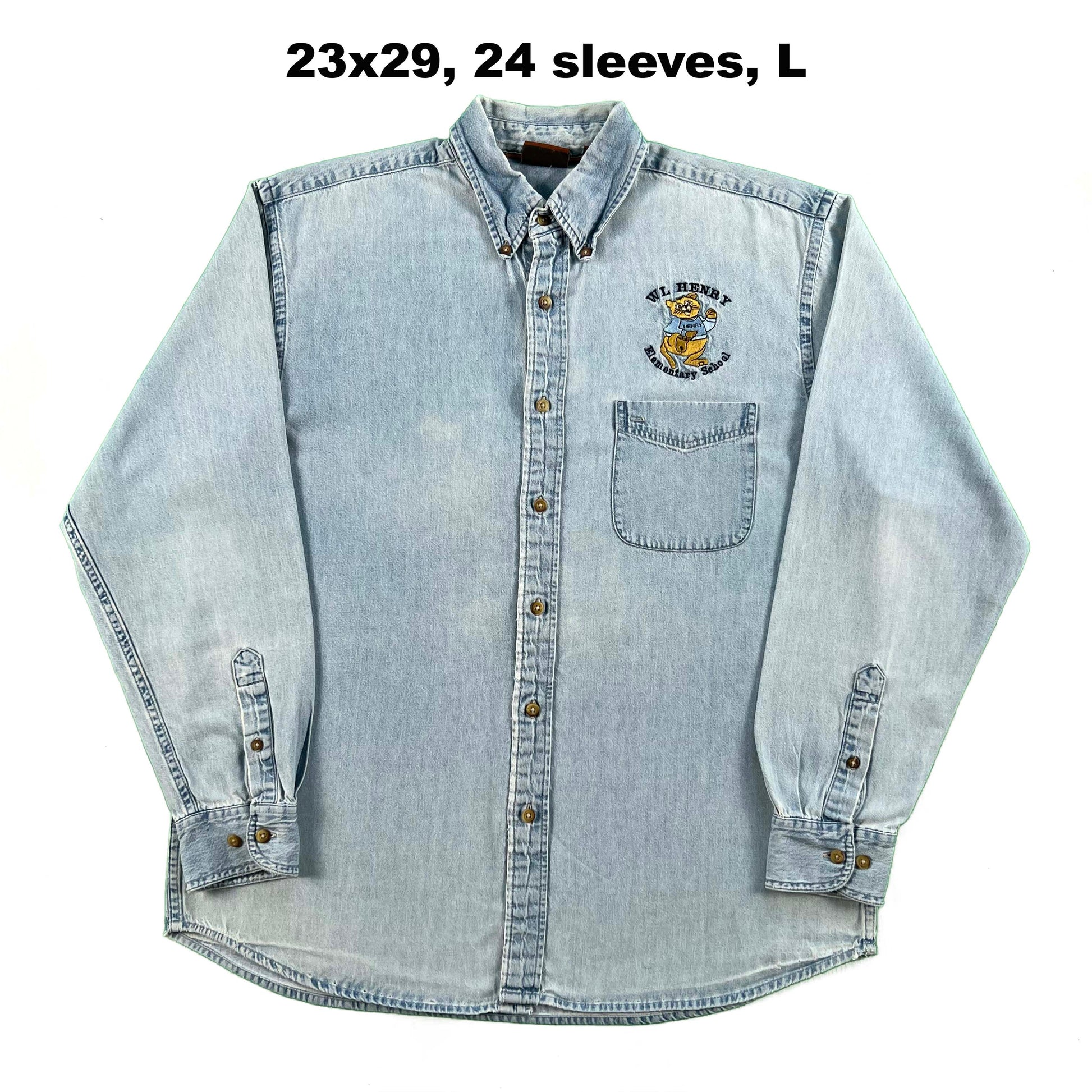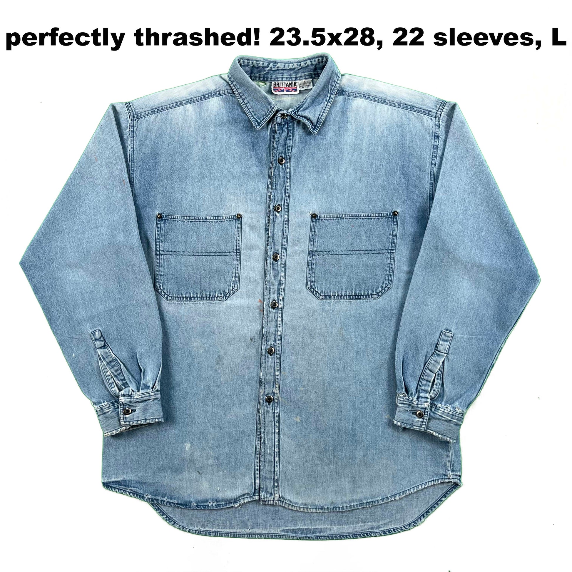 various vintage 1980s to 2000s 100% cotton denim button up shirts! most of these are a light wash and will feature some branding above the left pocket. I think it's super fun rocking the random brands or companies!! the Chair Outlet one is a PERFECTLY worn in lighter wash denim button up shirt!! love the tattering and wear on the collar. grab this one and wear it even more! mix of washes, wear, distressing, etc. great layering pieces !