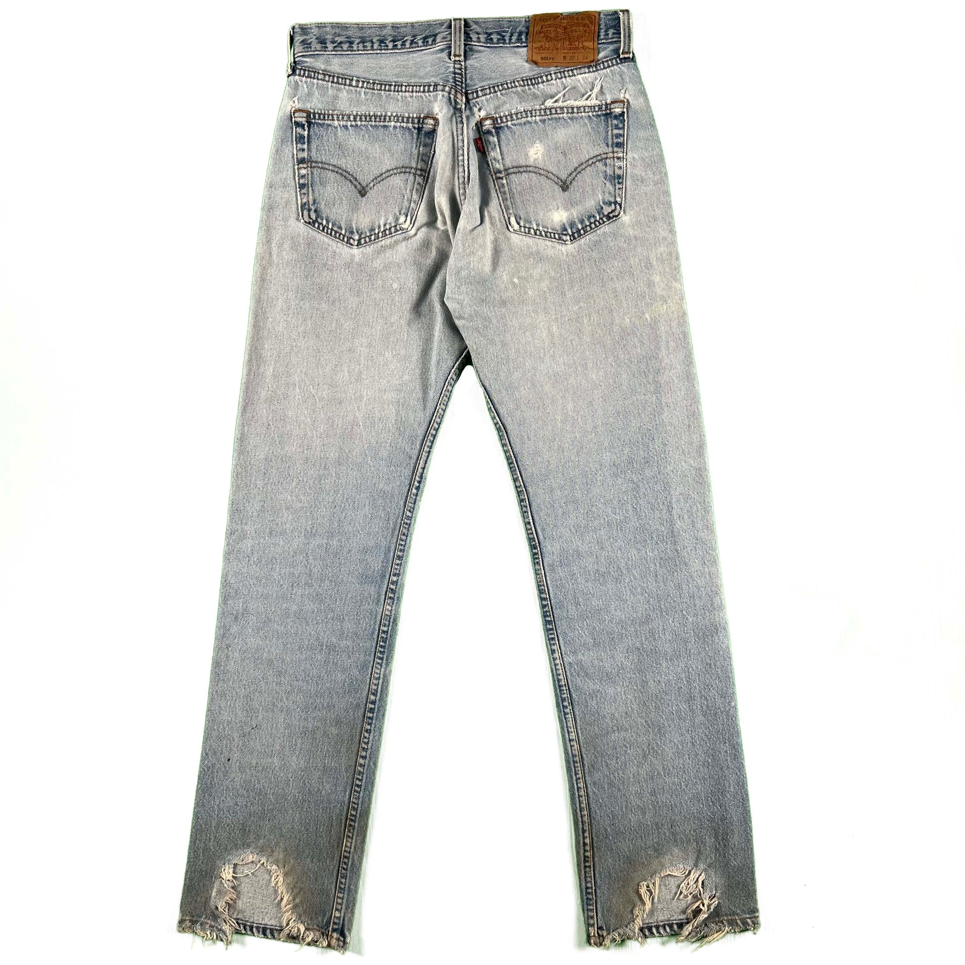beat up pair of made in USA light wash 501s!! love the rips and heel drag!! cute drawing on one knee!!