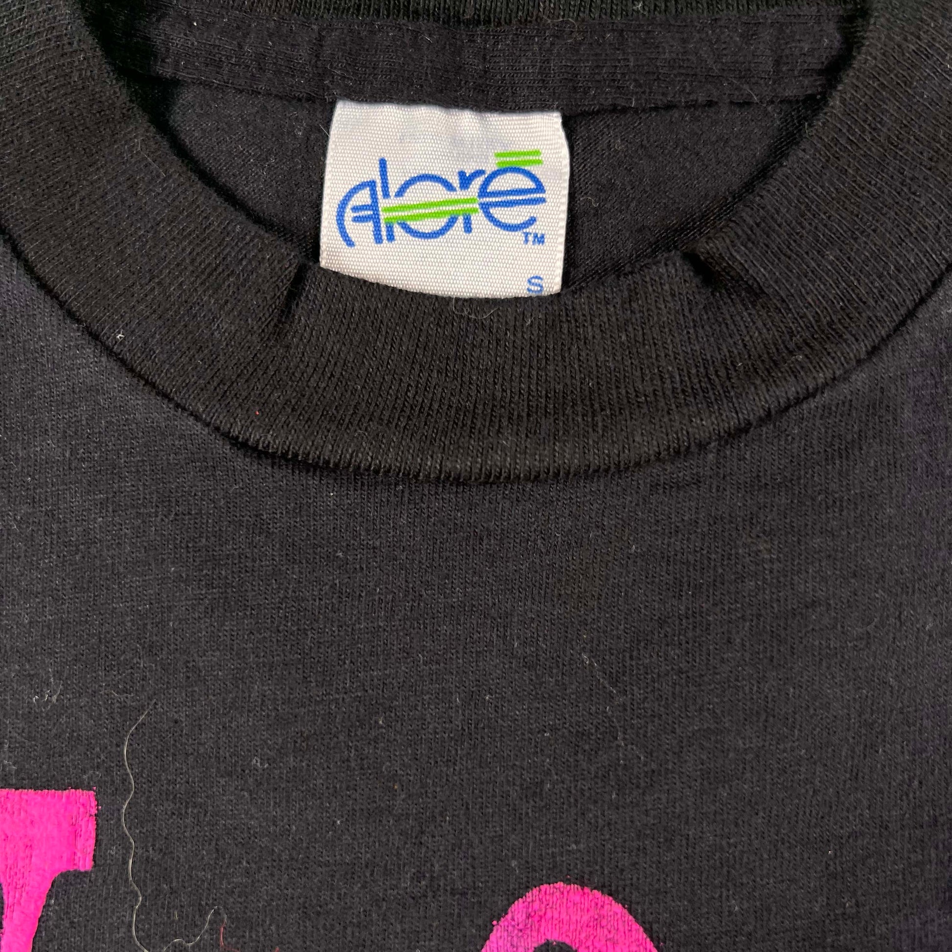 great single stitch black blank with big pink puff print text!! small town right on the Mississippi River/ Minnesota Wisconsin border