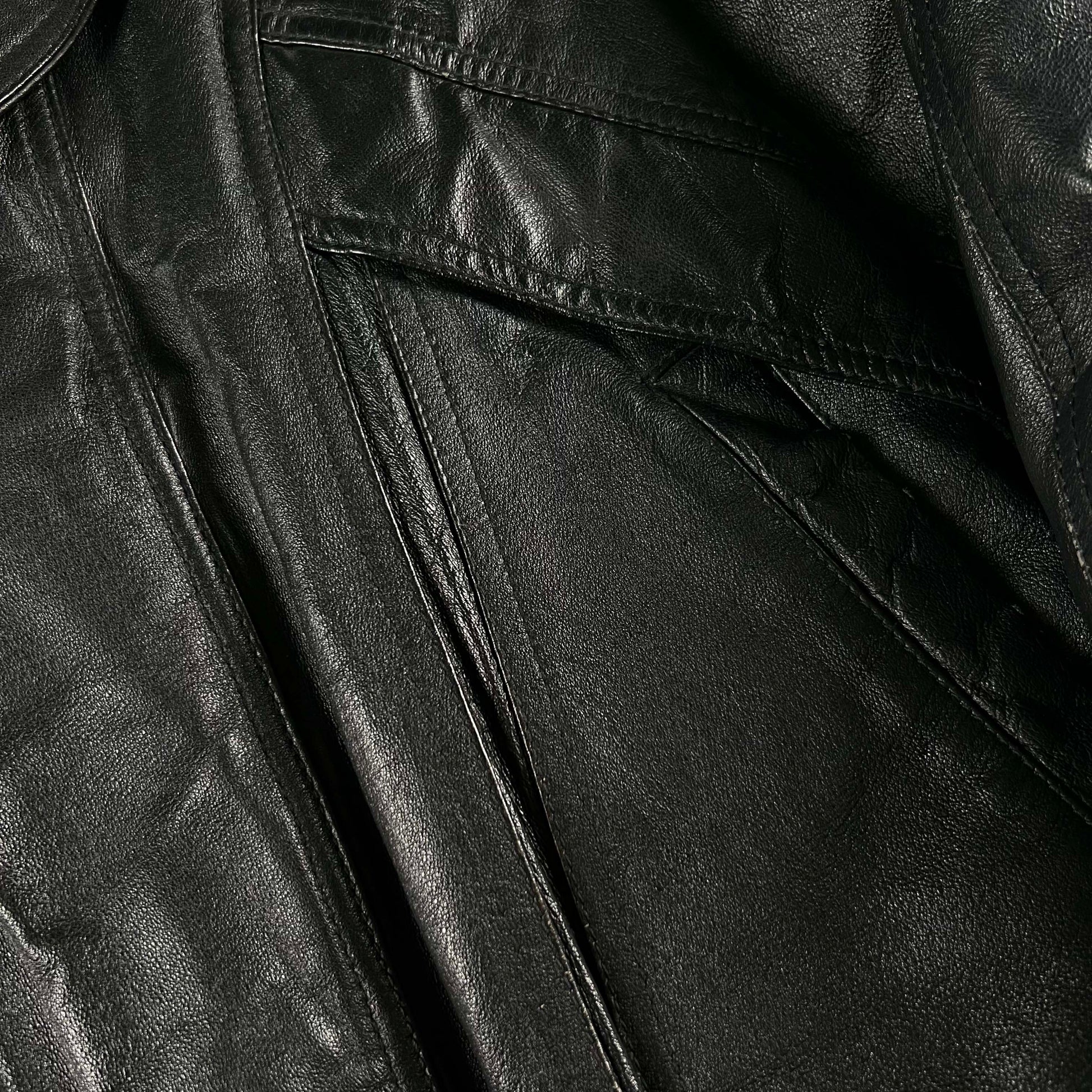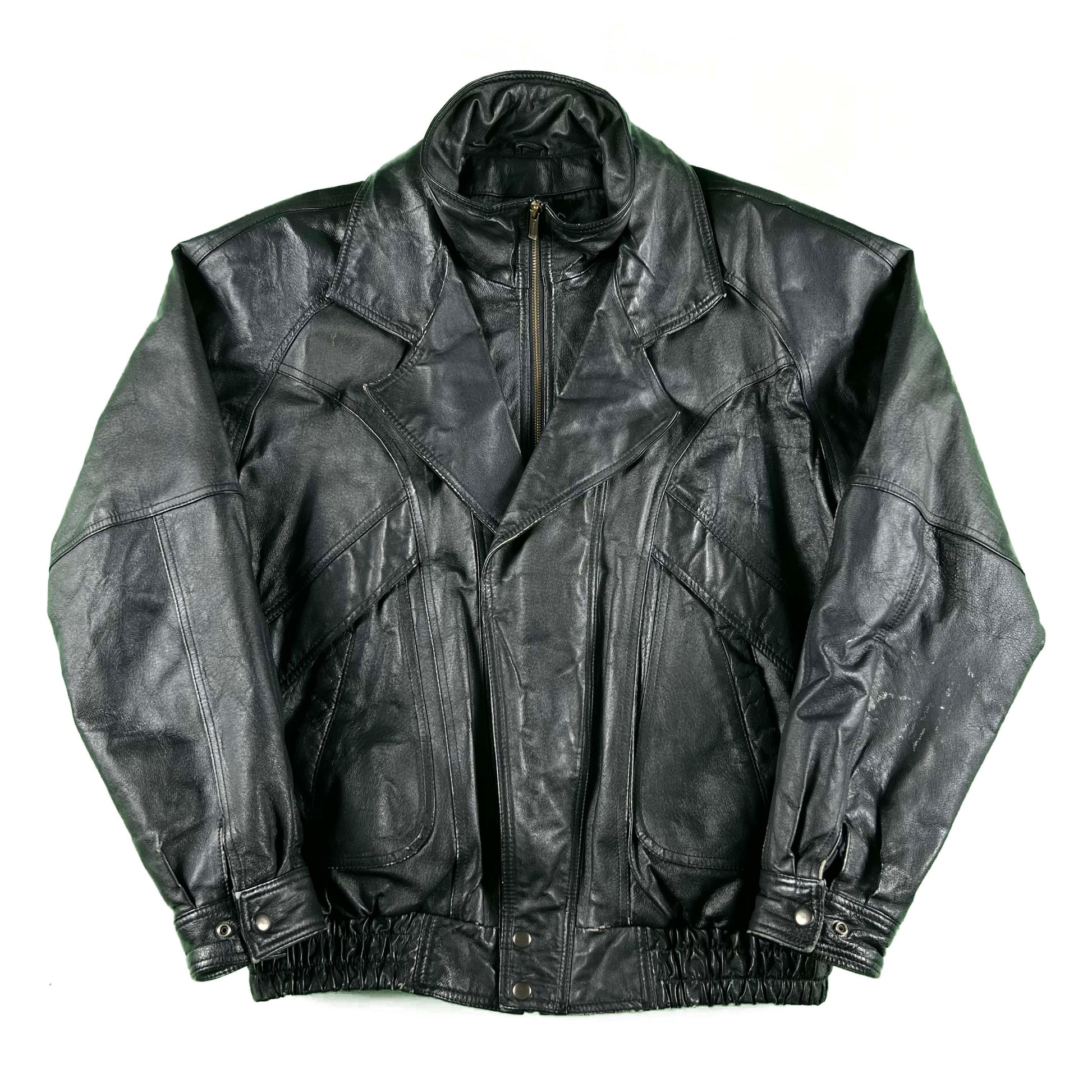 such a fantastic black leather jacket with an A2 bomber design, slant pocket covers, a blazer like collar, and plenty of other fun details!! gives my NYC vibes, some markings/patina and wear