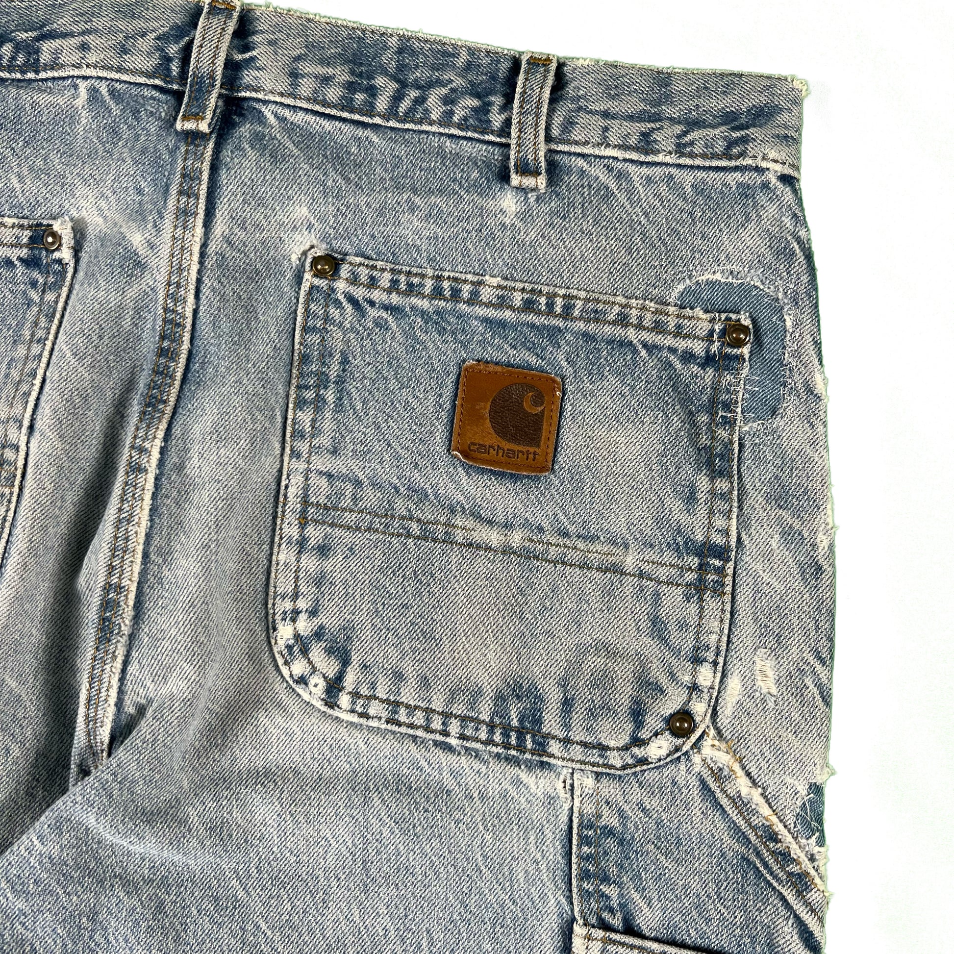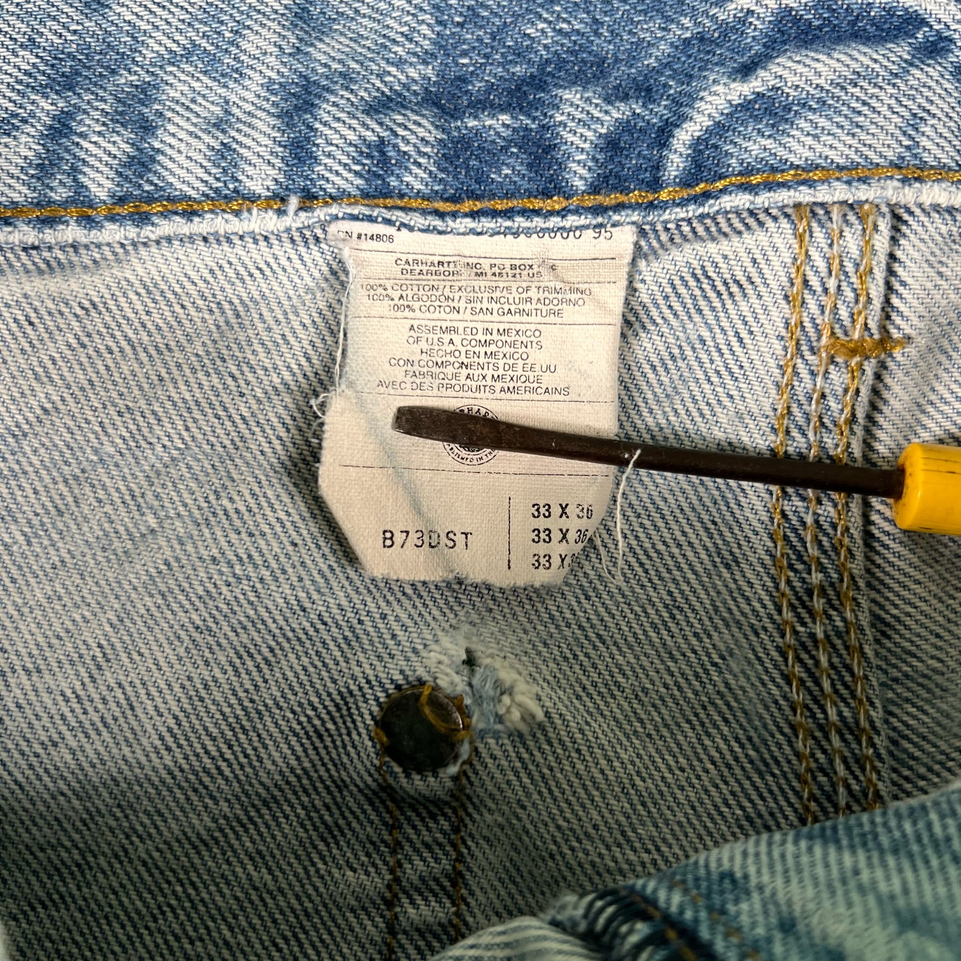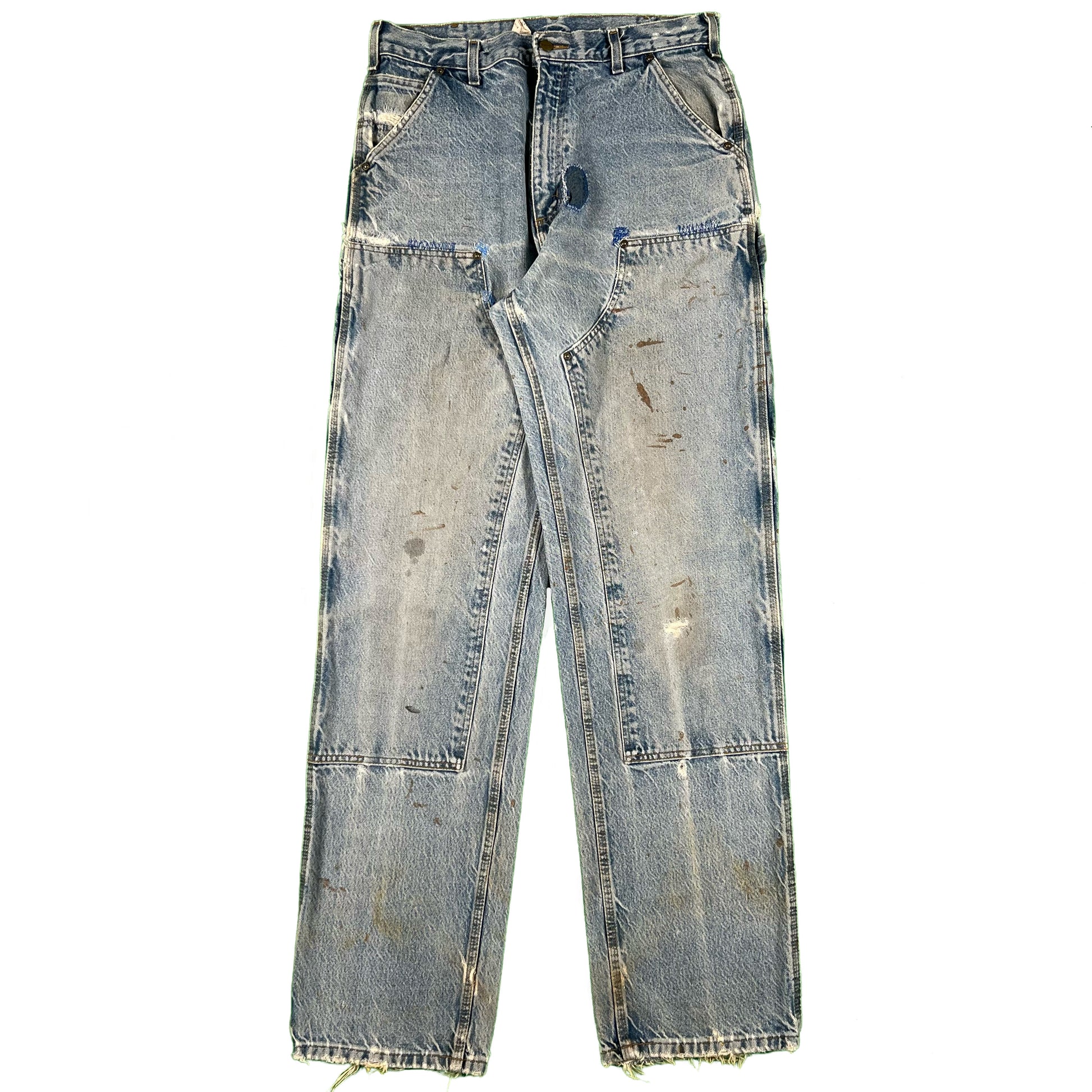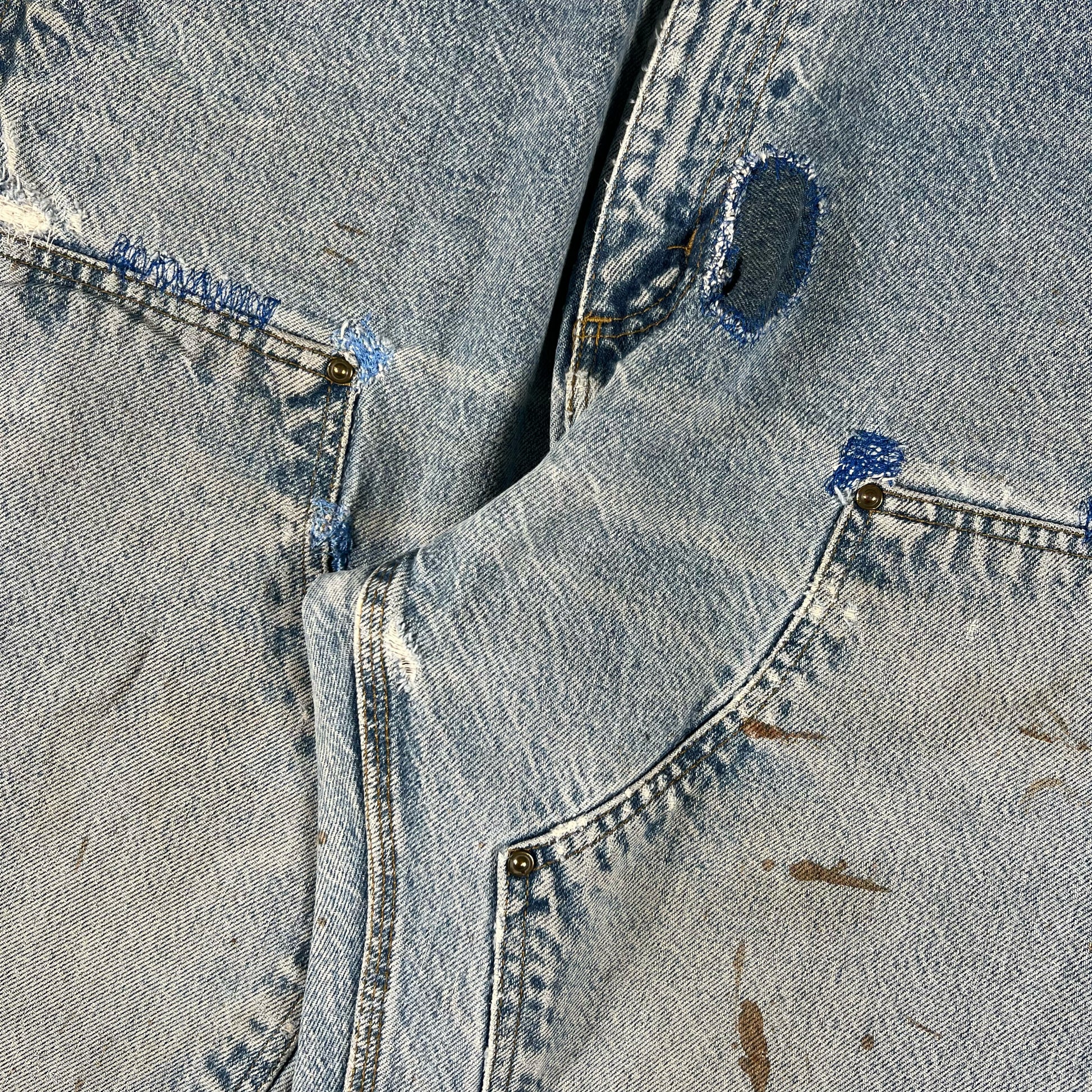 light wash Carhartt double knee carpenter denim with repairs done in house! has some fading and wear