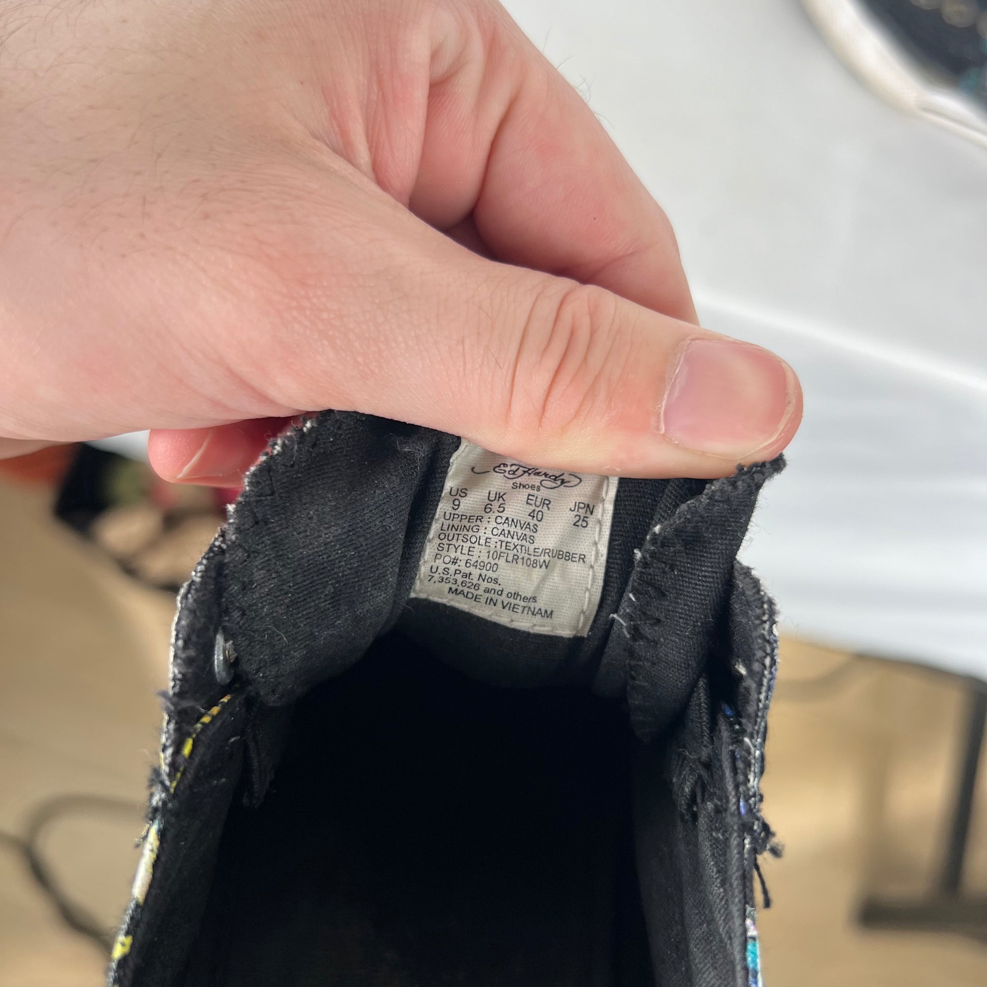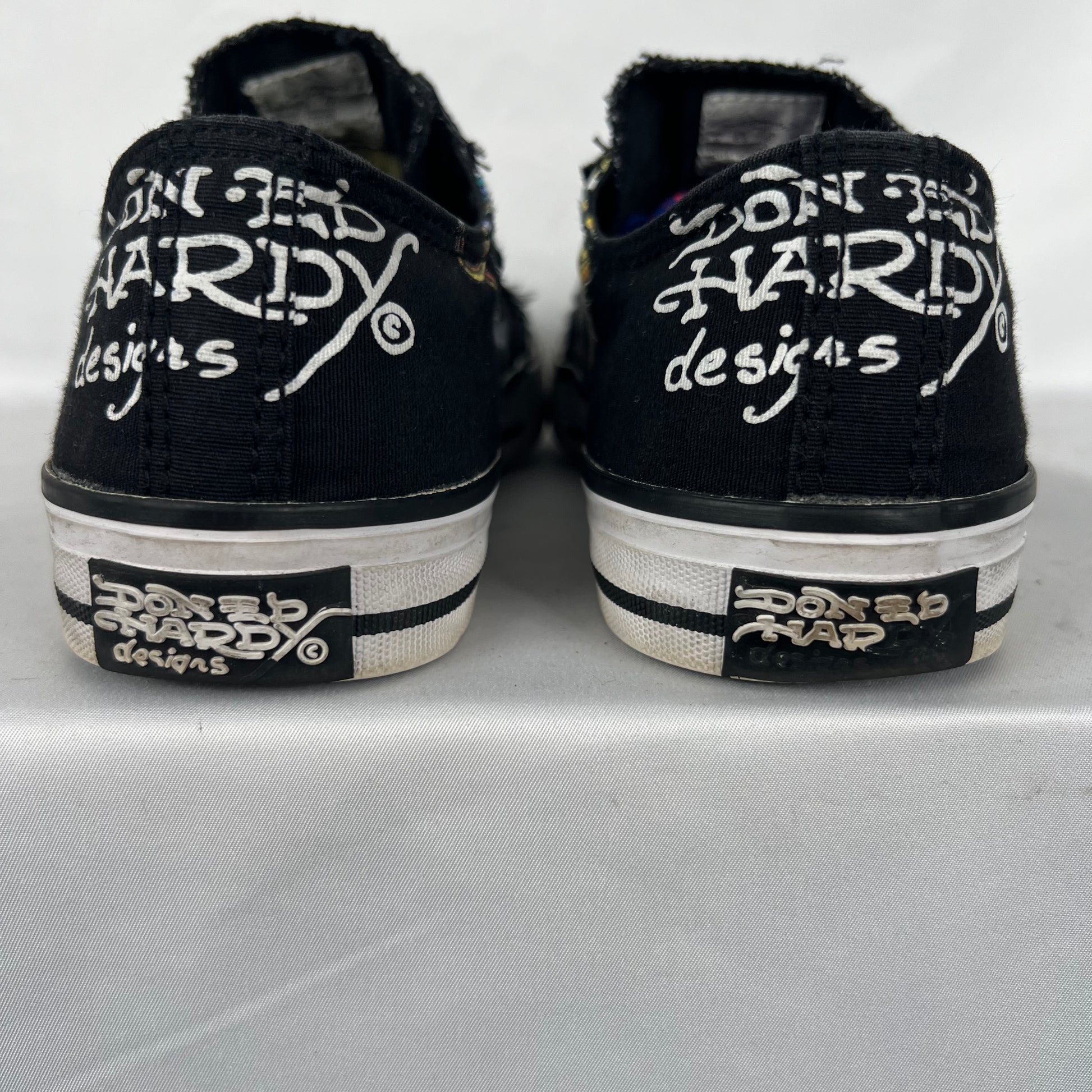 love these!! sweet slip ons from Don Ed Hardy with skulls and a tiger. clean black color and in quite solid shape. love the laceless design. I included a pic of my personal pair of these!! not for sale but I do enjoy rocking this style of shoe!!!