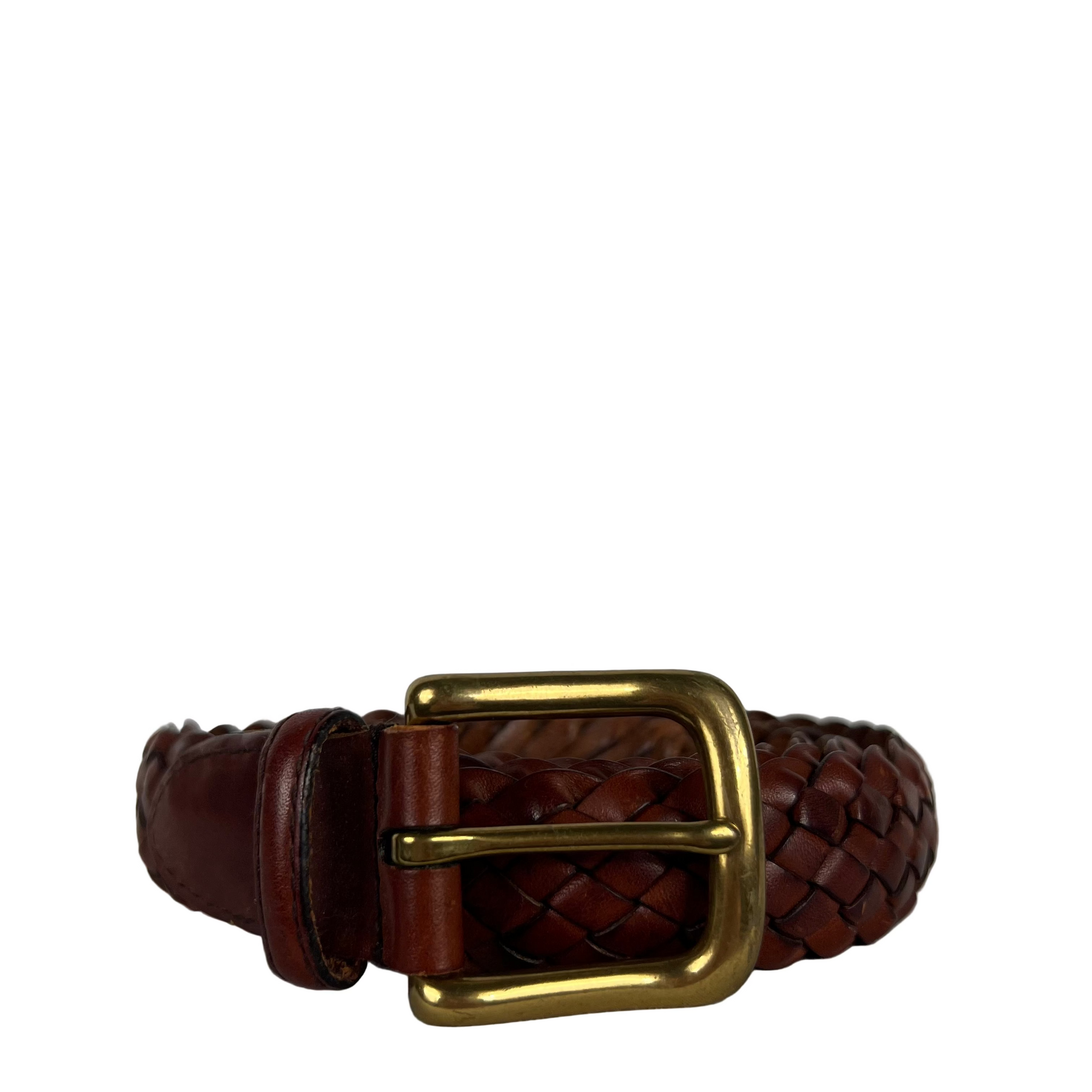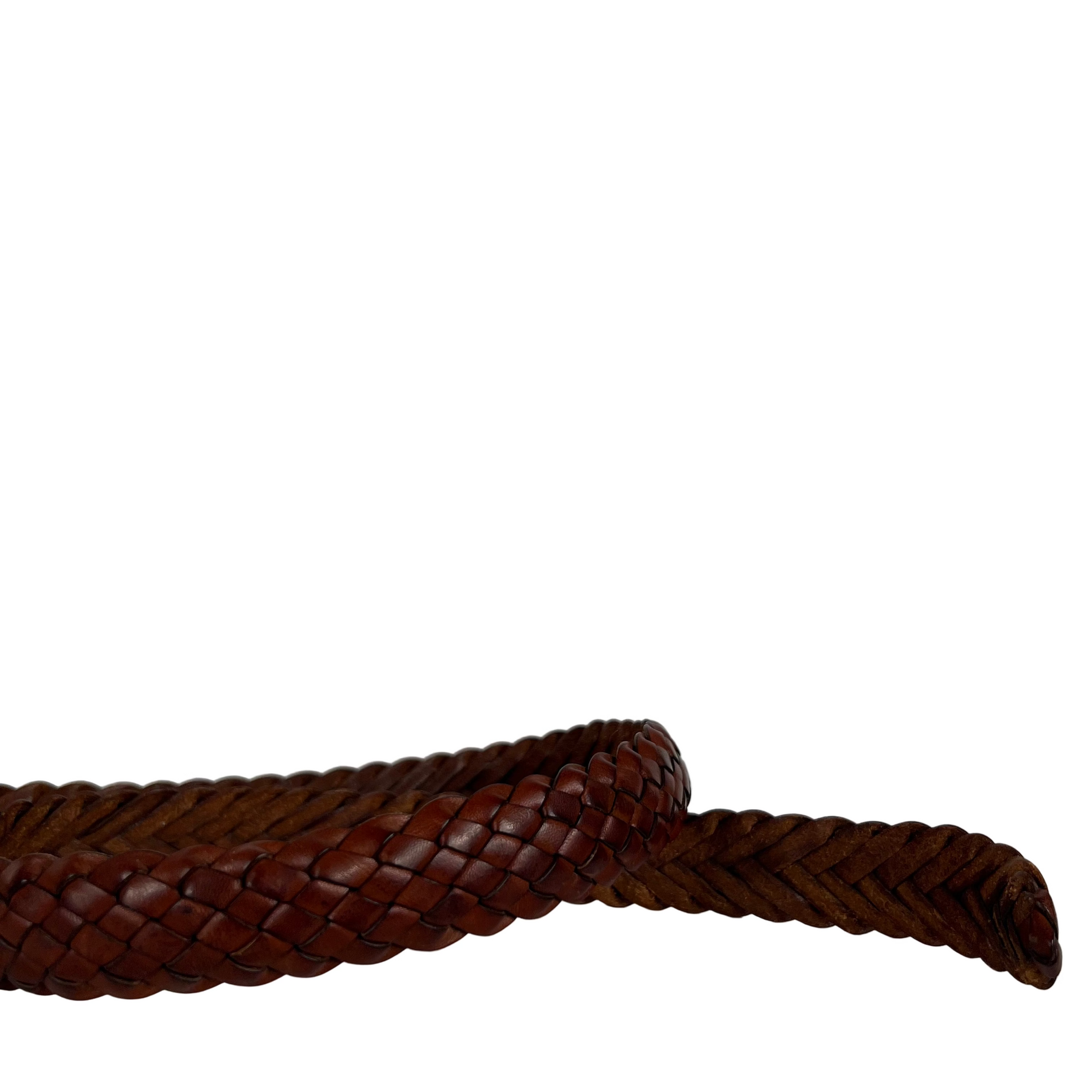 killer dark brown braided woven leather belt!!! features a solid brass buckle