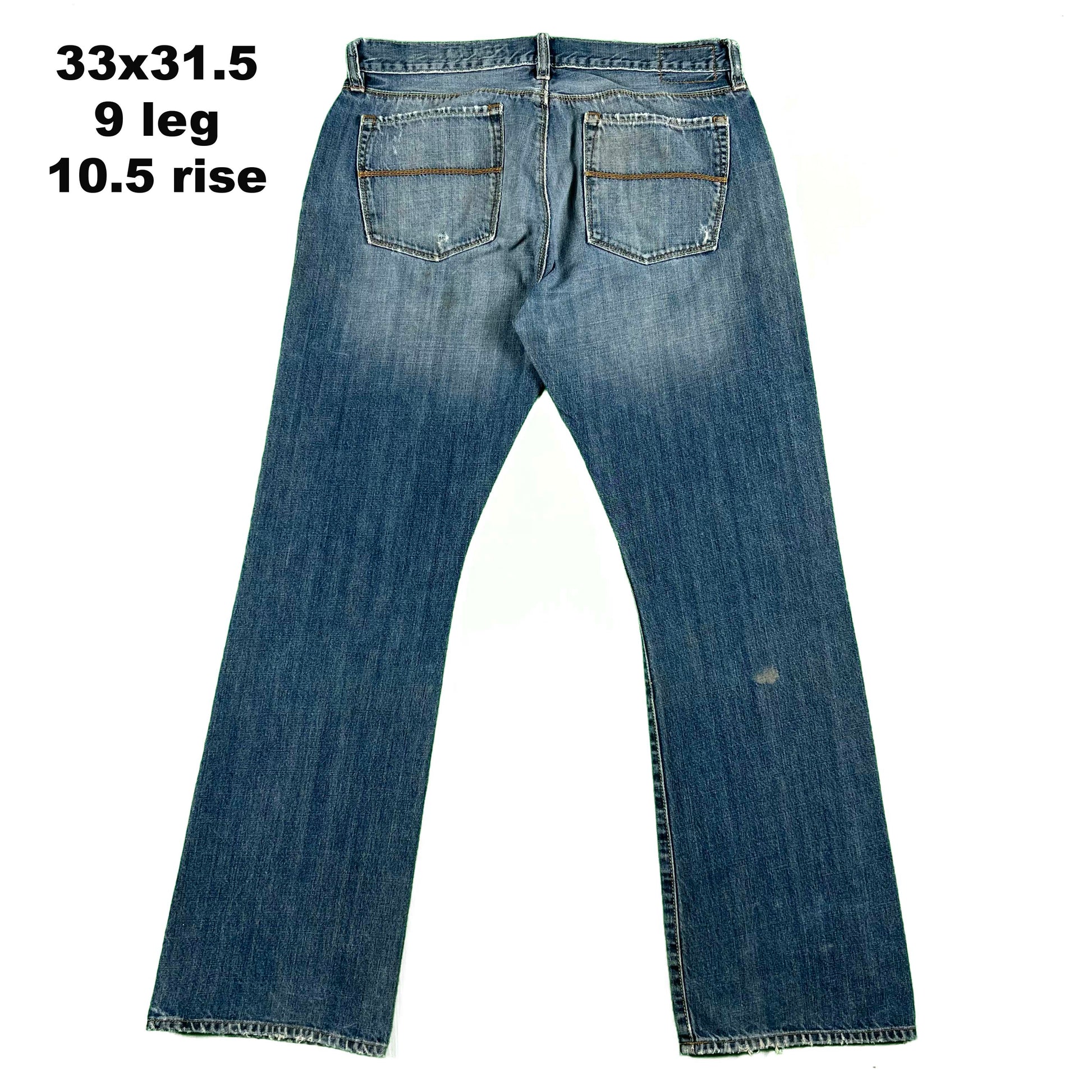 gorgeous variously faded denim with a boot cut/flared fit, variety of washes, fading, and paint markings, lower rise on these guys.