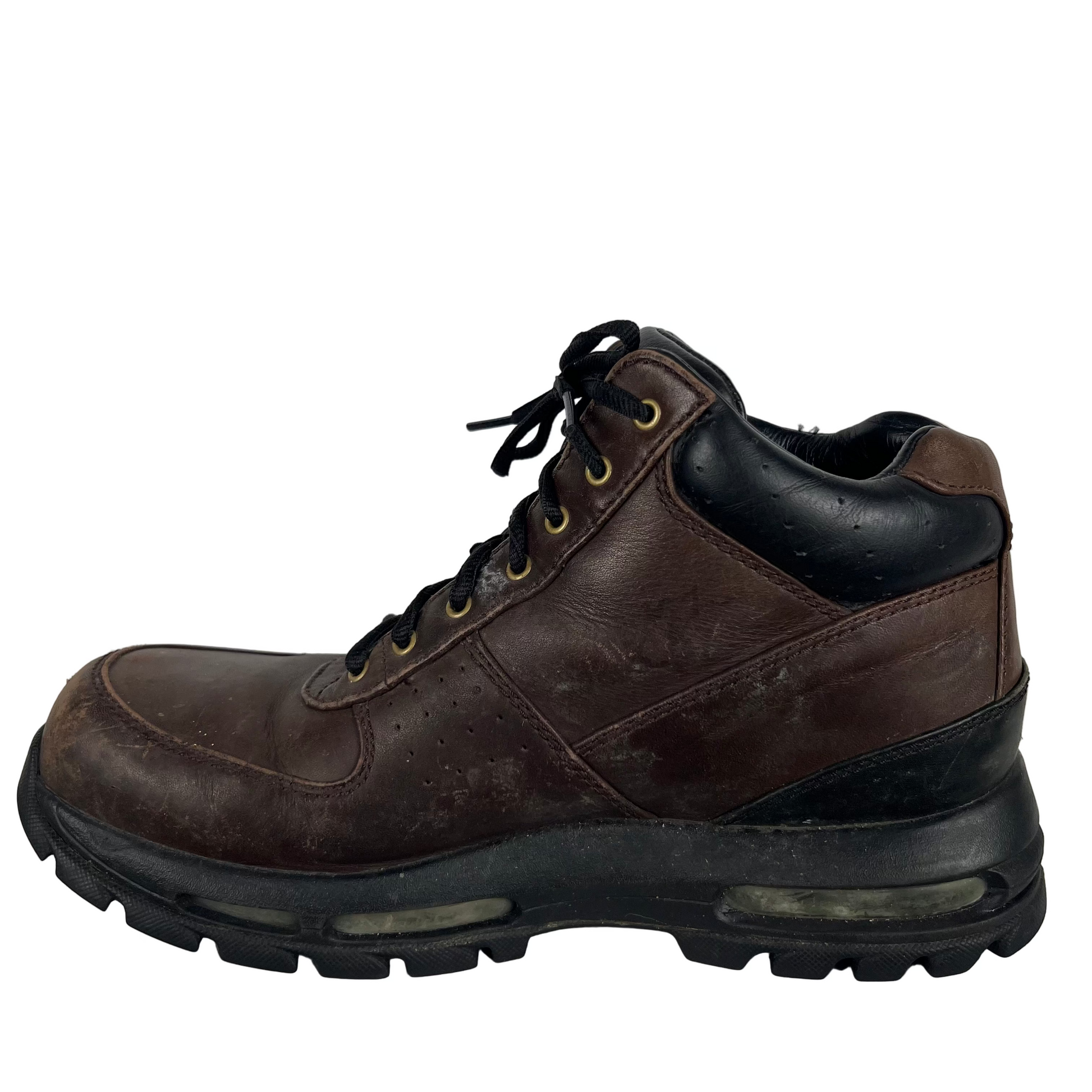 absolutely gorgeous Nike ACG hiking style boots with the classic air bubbles. love the deep mocha brown leather with black laces and detailing. bottom of the shoes are in awesome shape and are ready for a fall of hikes and good outfits. some general wear on the tops of the kicks