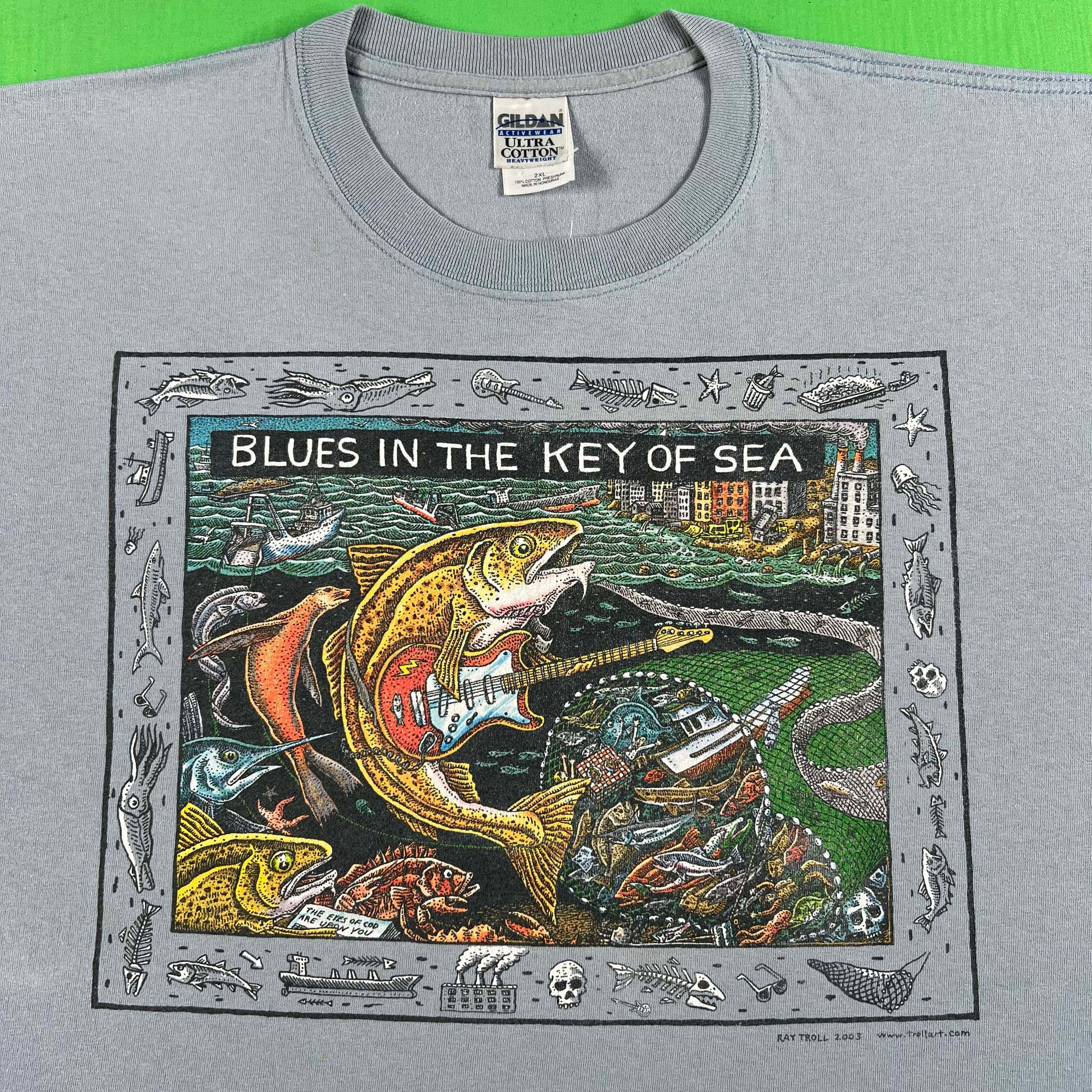 I absolutely love these Ray Troll fish art tees!!! this one features a cod or pollock playing a guitar as well as various other fish and sealife. dated 2003 but so far I've only gotten in tees from the 2010s. Also so far, just on some nice faded blue/grey blanks. The one I just put in stock has a bit more wear...sick fishing x art tees!