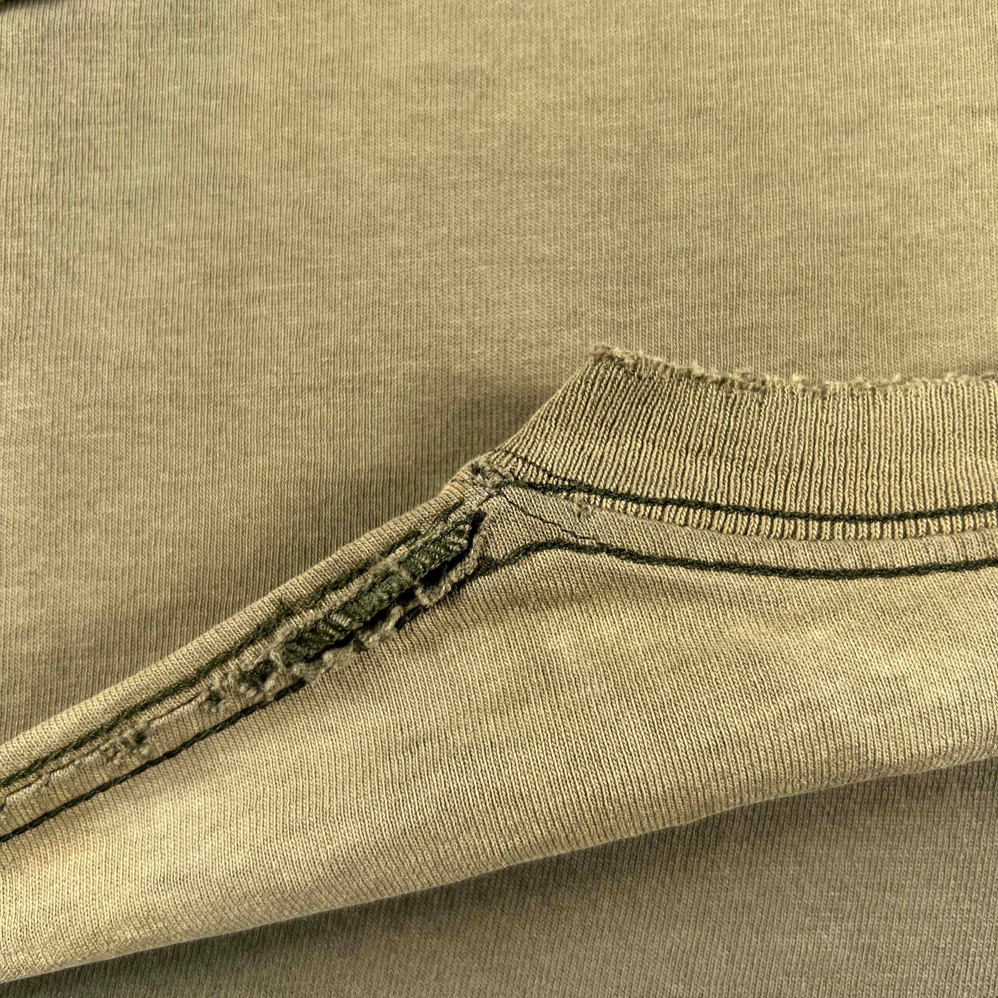 another perfectly worn tee!!! love all the sun fading, wear, and slight holes. Honestly not quite sure how it got look like this...maybe rolled sleeves? dark olive x army green color