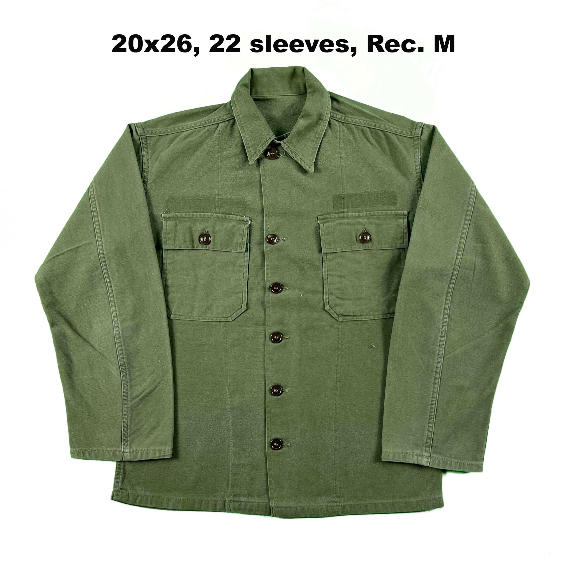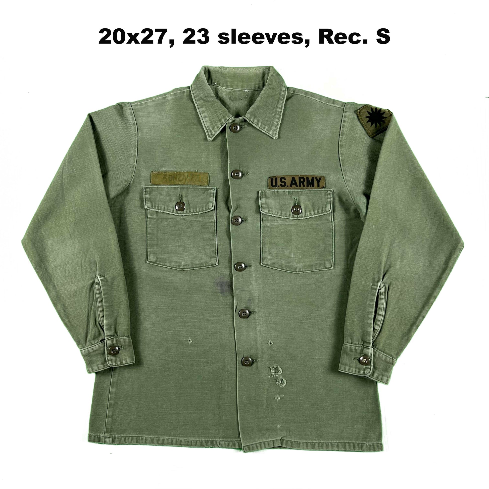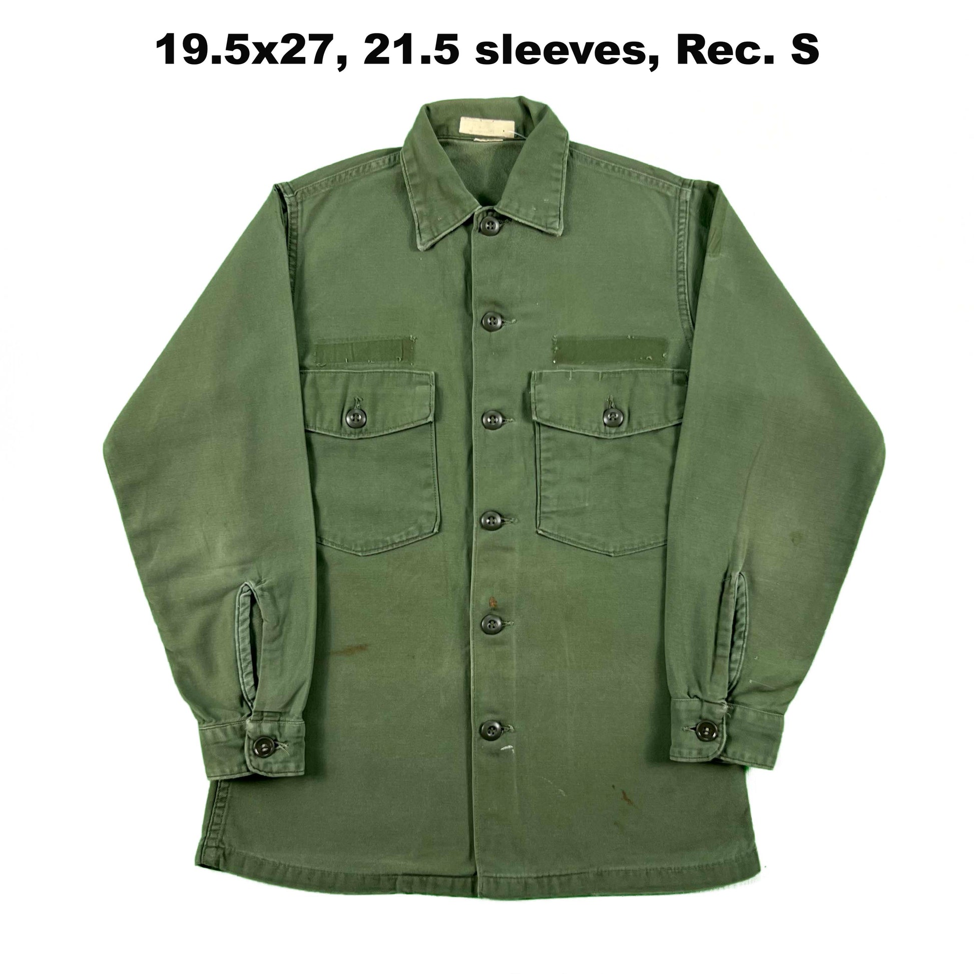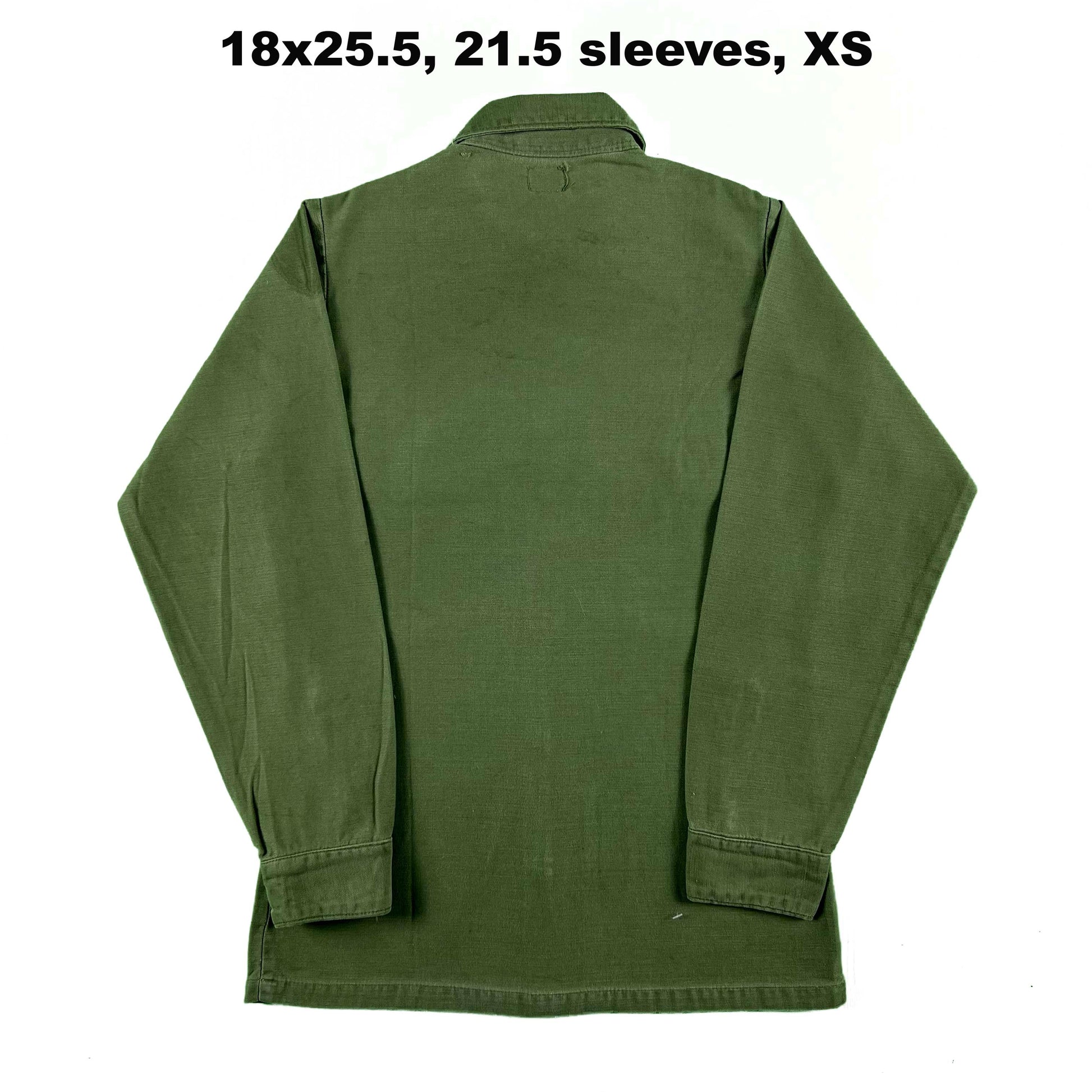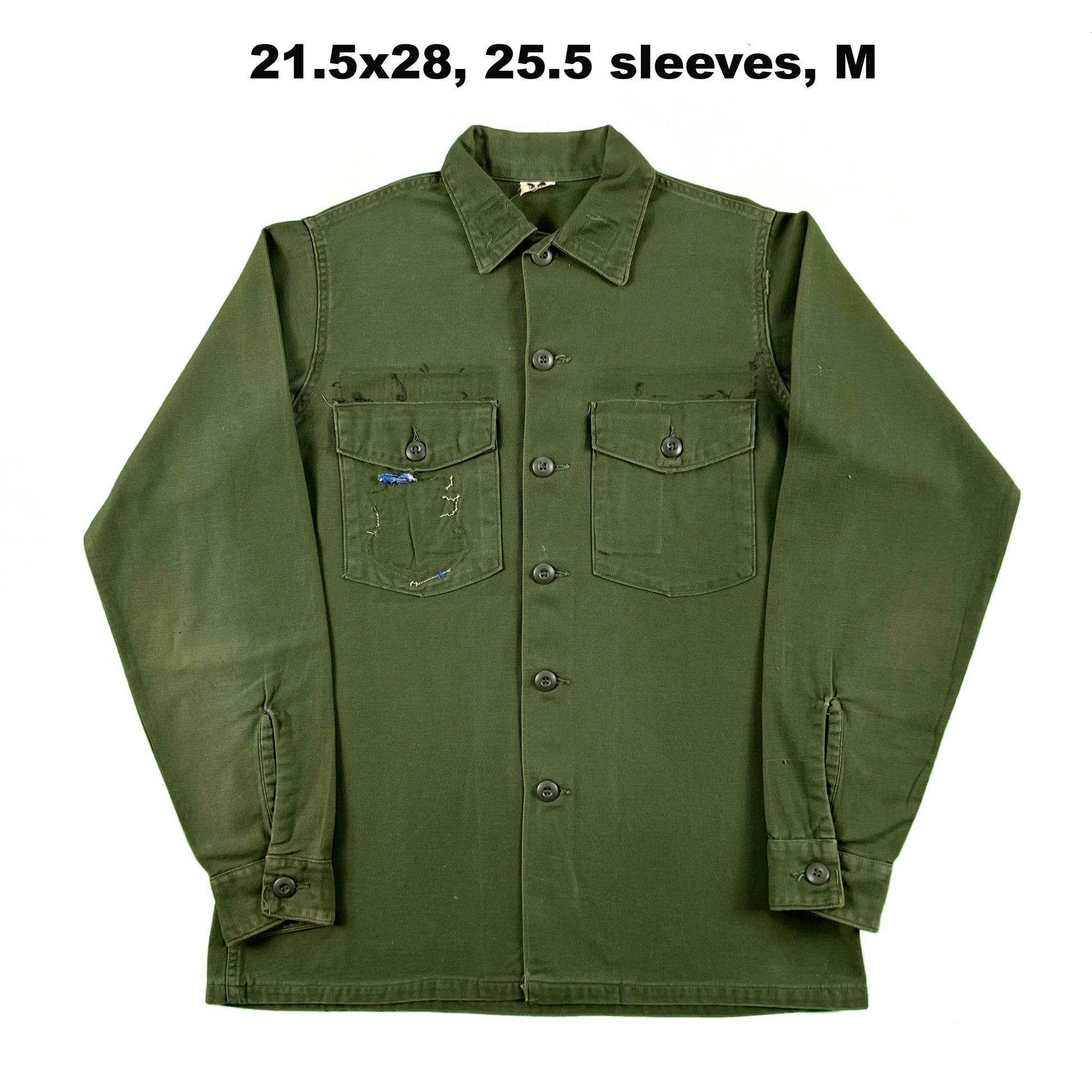 cotton army button up shirts!! nice heavier layering piece. multiple tops in stock, all have various wear, patches, stenciling, and more. lots of them will have stains, holes, and markings as they are 50 to 60 years old! Vietnam Era shirts to be specific. We recommend you pick your true to size fit. Select the exact shirt you want!!! all are measured :)
